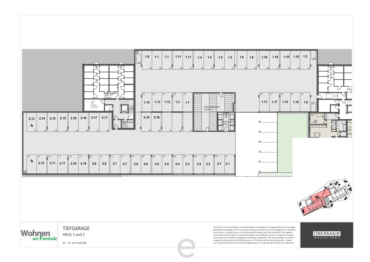 Alle Wohnungen verfügen über eine große_ südlich oder westlich ausgerichtete Loggia sowie im Erdgeschoss über einen eigenen Garten._ _Zu jeder Wohnung gehören ein Kellerabteil und mindestens ein Tiefgaragenplatz._ Die Zufahrt in die Tiefgarage erfolgt im Süden über den Farnholzweg und ermöglicht ein _autofreies, naturnahes Wohnerlebnis_. Überdachte Abstellplätze für Fahrräder, der Kinderwagenabstellraum sowie auch die Kellerabteile und die Technikräume befinden sich in der Tiefgarage. _Der Zugang zum Treppenhaus als auch zu allen Wohnungen ist barrierefrei. _Alle Wohnungen sind mit dem Lift erreichbar. Optional stehen in der Tiefgarage 3 Motorrad-Abstellplätze zur Verfügung - Kaufpreis auf Anfrage!