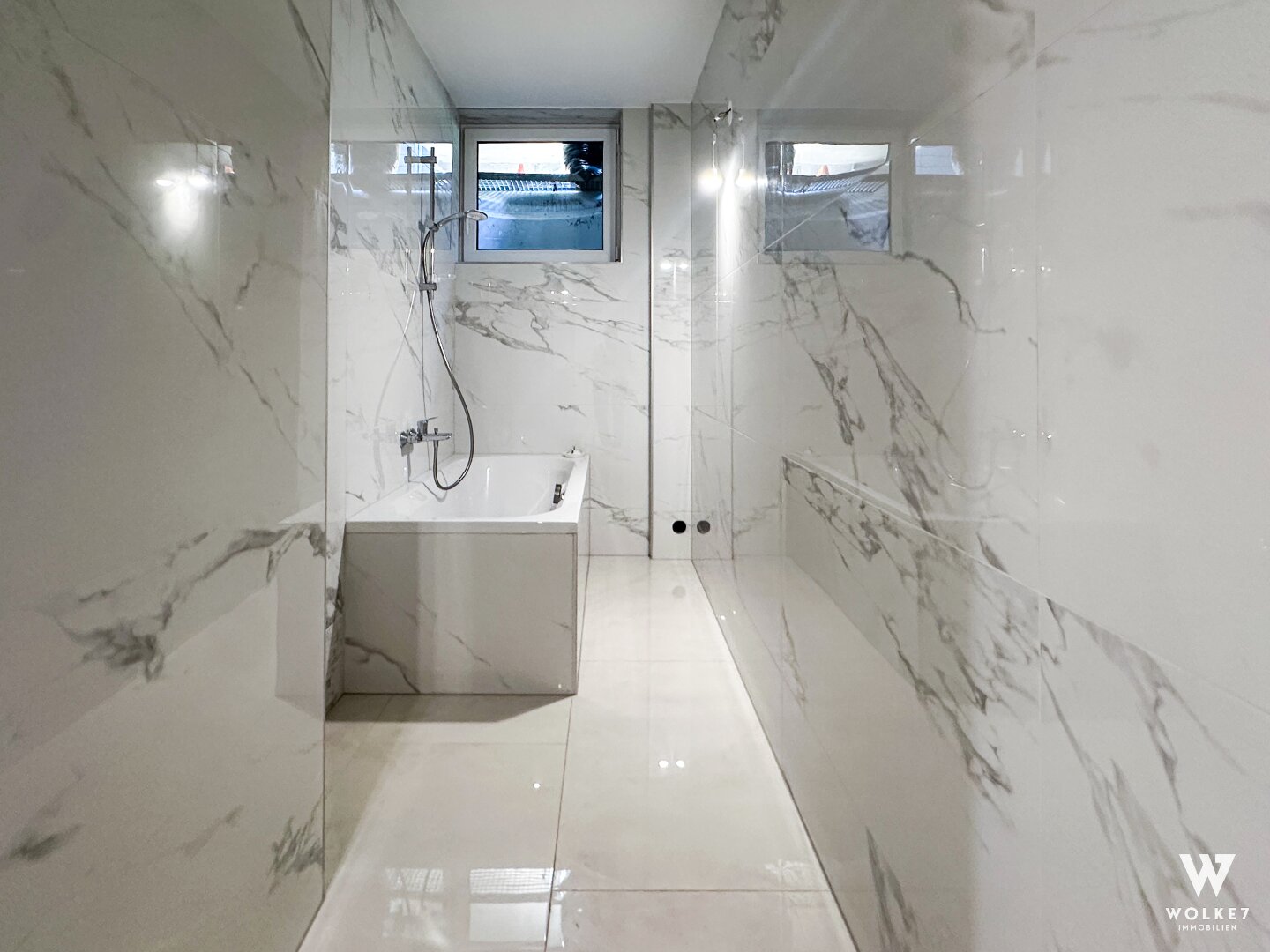 Hochwertiges Badezimmer in Marmoroptik mit Badewanne, WC und Waschtisch