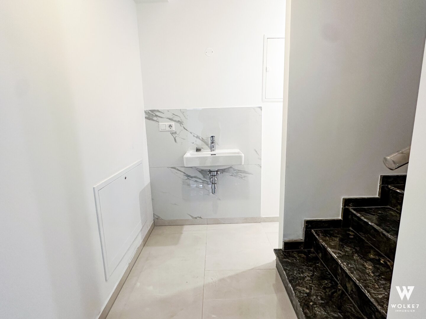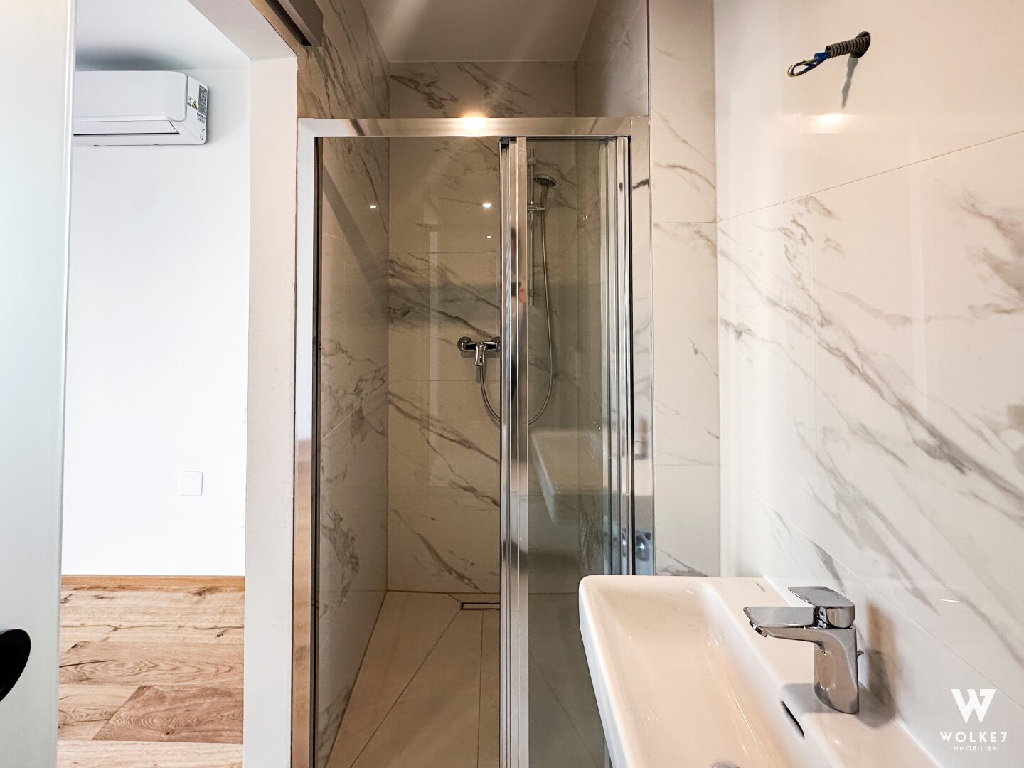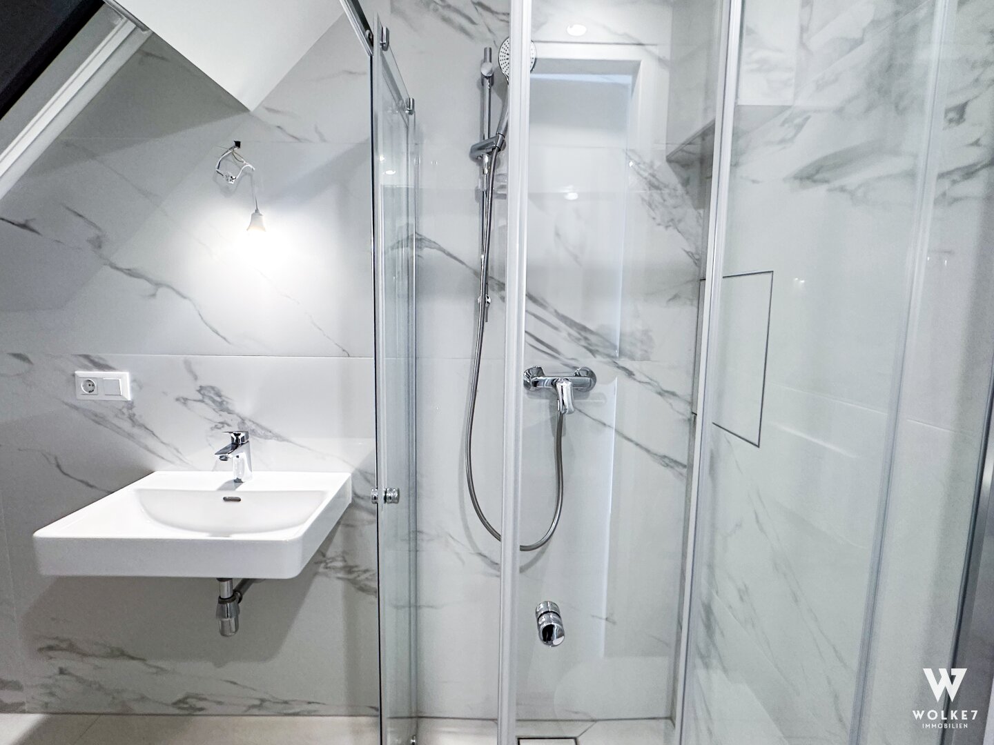 Drittes Badezimmer mit Dusche, WC und Waschtisch, Marmoroptik
