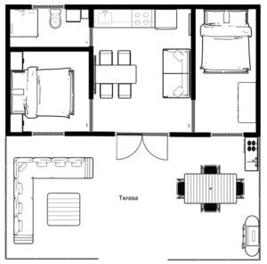 * Ausstattung: Moderne Küche mit Wohnzimmer, TV, Wi-Fi, 2 gemütliche Schlafzimmer, Klimaanlage, Bad mit Dusche, großzügige Terrasse