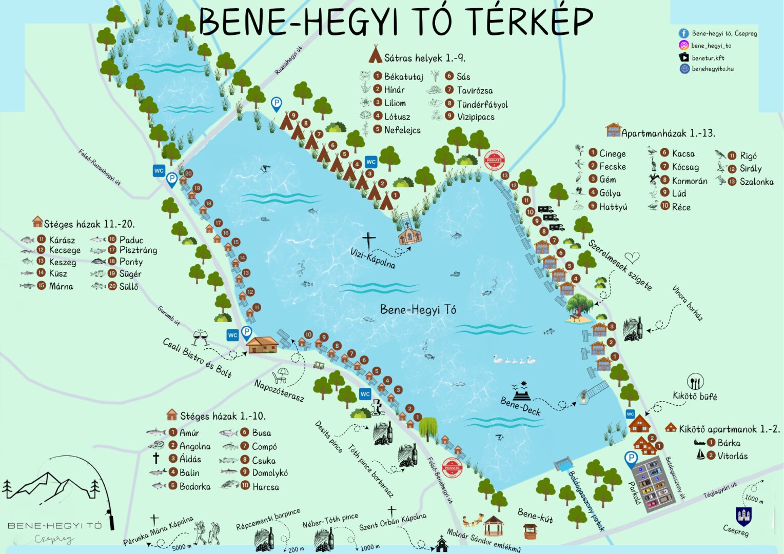 Die Freizeitanlage am Bene-hegyi See in Csepreg, Ungarn, ist ein idyllischer Rückzugsort im Herzen von Vas megye, umgeben von der sanften Hügellandschaft der Alpenvorlandes. Der See erstreckt sich über eine Fläche von 21,4 Hektar und wird von der Benetur Kft. betrieben, einem familiengeführten Unternehmen, das seit 2023 kontinuierlich in die Entwicklung und Modernisierung der Anlage investiert .