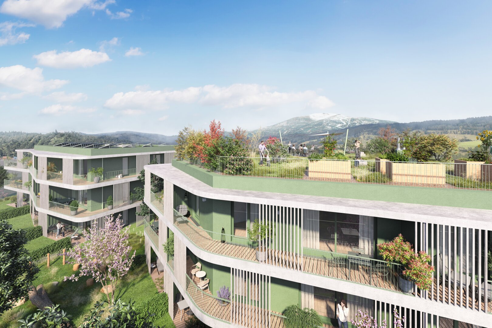 Das absolute Herzstück des Gebäudes ist das begehbare Gründach. Diese grüne Oase der Entspannung bietet auf ca. 200 m² Fläche nicht nur einen atemberaubenden Ausblick, sondern auch Platz zum Entspannen und Auftanken. Das Dach wurde mit heimischen Pflanzenarten und biodiversen Flächen gestaltet, um die ökologische Vielfalt zu fördern. Hier finden Sie eigens geschaffene Ruhezonen, in denen Sie die Natur in vollen Zügen genießen können. Ein wahrer Rückzugsort für die Bewohner – ganz im Einklang mit der Umwelt.