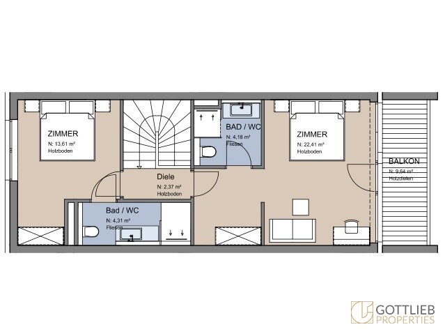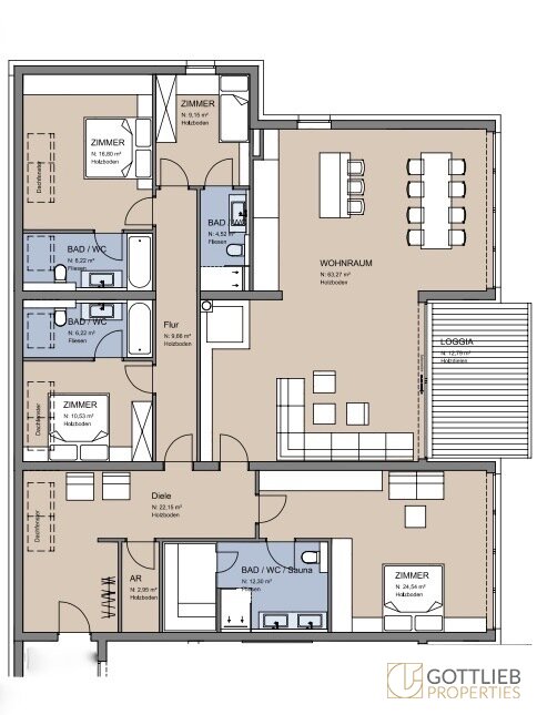 + Bäder mit bodengleichen Duschen, Waschbecken, Handtuchwärmer sowie Toilette