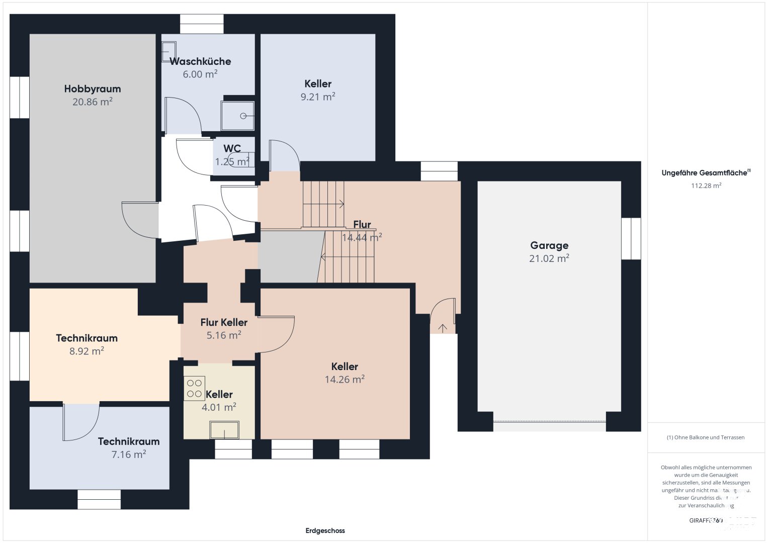 Der ca. 90 m² große, voll unterkellerte Bereich bietet vielseitige Nutzungsmöglichkeiten und beinhaltet mehrere Räume, eine Waschküche, ein WC sowie einen Waschmaschinenanschluss. Da das Kellergeschoss nur bis zur Hälfte unterirdisch gelegen ist bieten die großen Fenster durchgehend viel Helligkeit.