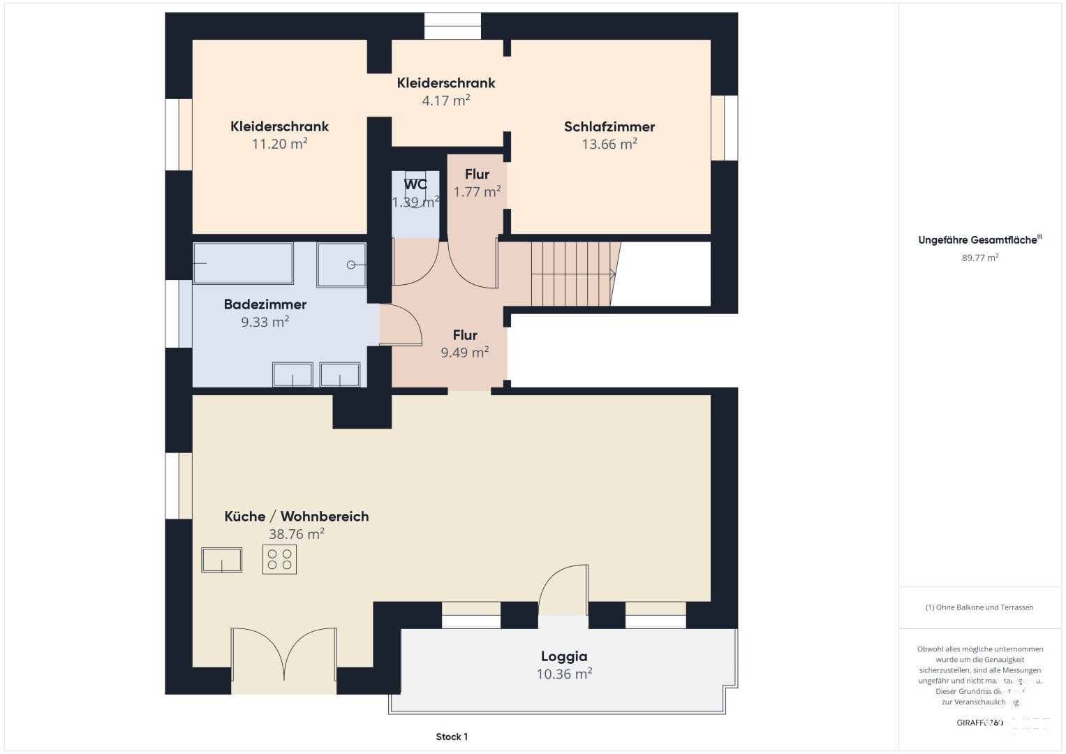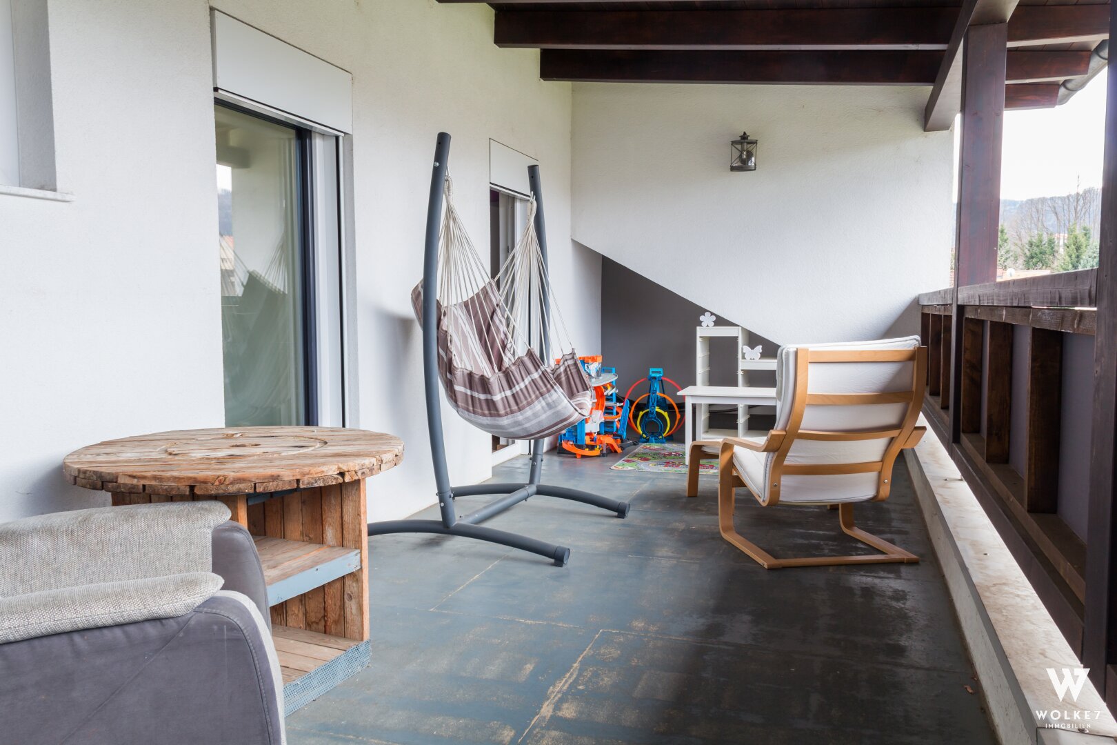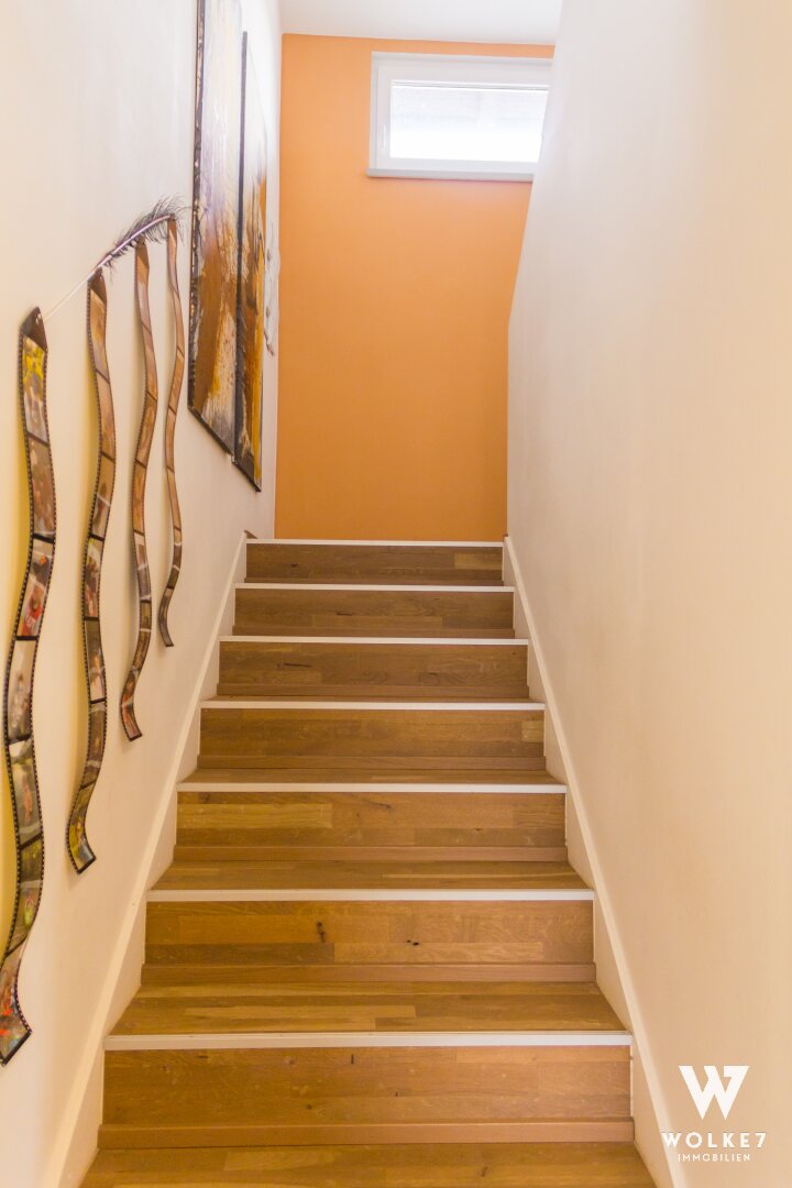 Über eine breite Holztreppe erreichen Sie das Obergeschoss, das zwei weitere Schlafzimmer sowie ein zusätzliches Badezimmer mit Dusche und WC umfasst. Die ca. 20 m² große West-Loggia ist von beiden Zimmern sowie vom Flur aus zugänglich. Sichtbare Holzbalken verleihen den Räumen eine besondere Wohnatmosphäre.