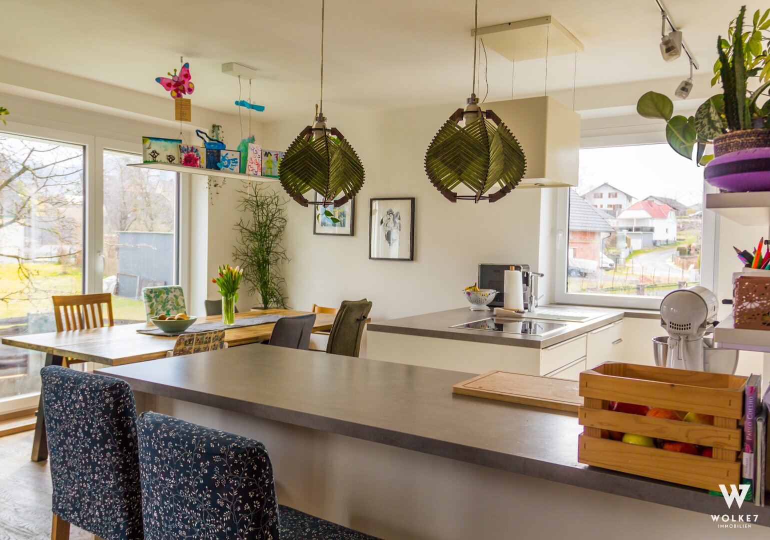 Das Erdgeschoss empfängt Sie mit einem einladenden Vorraum, von dem aus alle weiteren Räume zugänglich sind. Der offene Wohn- und Essbereich beeindruckt mit großen Fensterflächen und einer modernen Küche samt Kochinsel, Backofen in angenehmer Arbeitshöhe sowie integriertem Geschirrspüler. Von hier aus gelangen Sie auf die ca. 10 m² große Süd-Loggia – perfekt für entspannte Stunden im Freien.