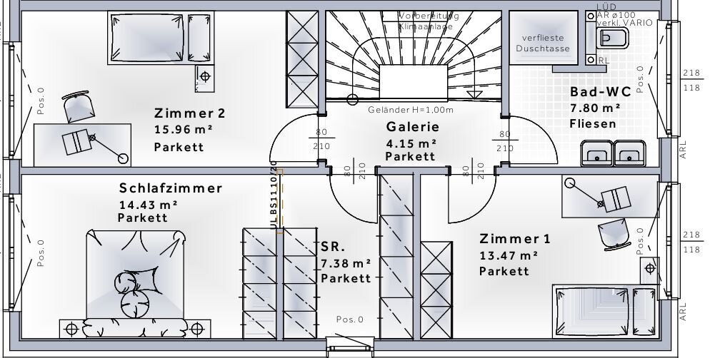 Galerie, 3 Schlafzimmer (Hauptschlafzimmer mit eigenem Schrankraum), Badezimmer mit Doppelwaschtisch, WC und Dusche.