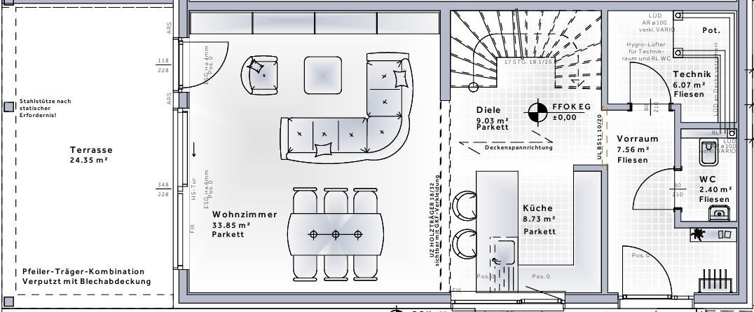 Vorraum, Technikraum, WC mit Handwaschbecken, offene Wohnküche, Wohn/Essbereich mit Ausgang auf die Terrasse
