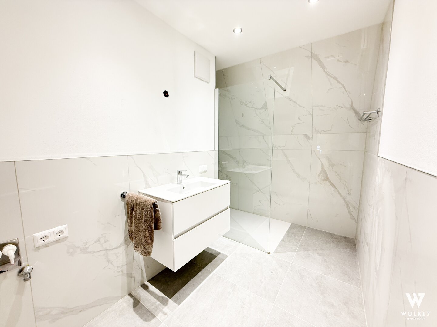 Modernes Bad mit Dusche, stilvolle Fliesen in heller Marmoroptik