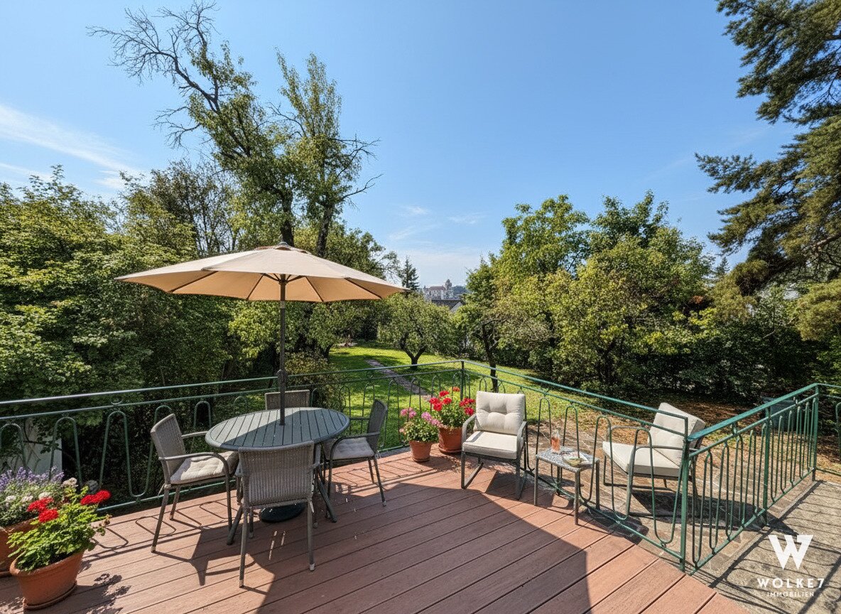 Das Haus befindet sich auf einem ca. 1.020 m² großen Grundstück in ebener Hanglage mit freiem Blick auf die Burg Liechtenstein – ein seltenes Juwel in exklusiver Villenlage.