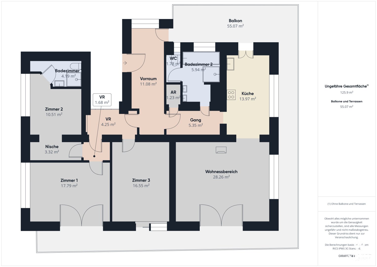 * 55 m² großer Balkon der von 3 Zimmern und der Küche aus begehbar ist