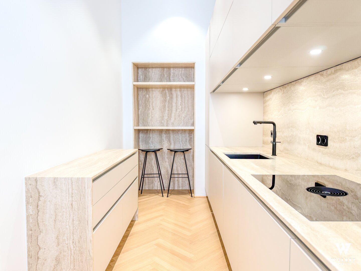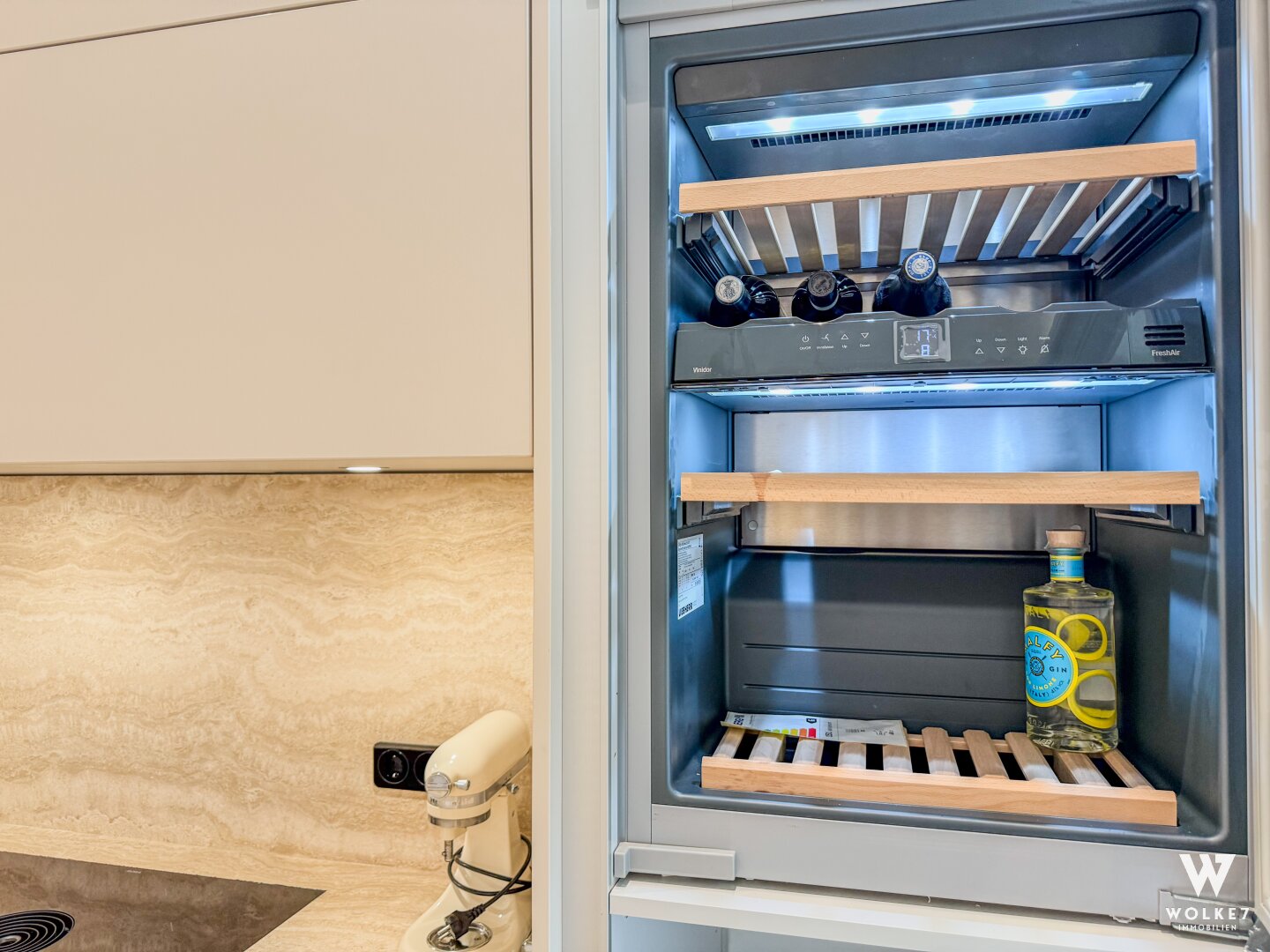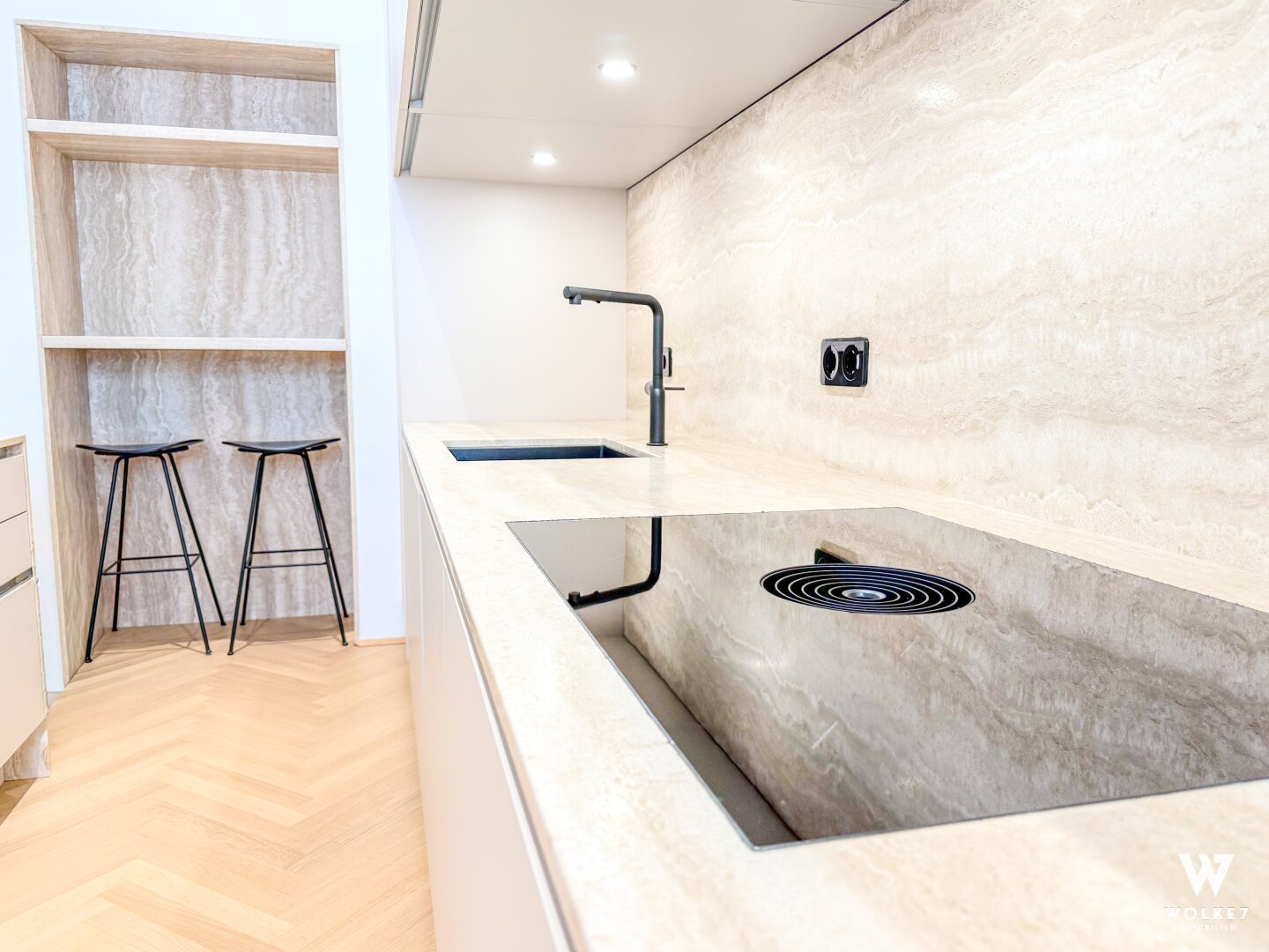 Edle Küche mit hochwertigen Travertin-Kalksteinplatten und Markengeräten wie einem Bora-Herd und einem Weinkühlschrank von Liebherr