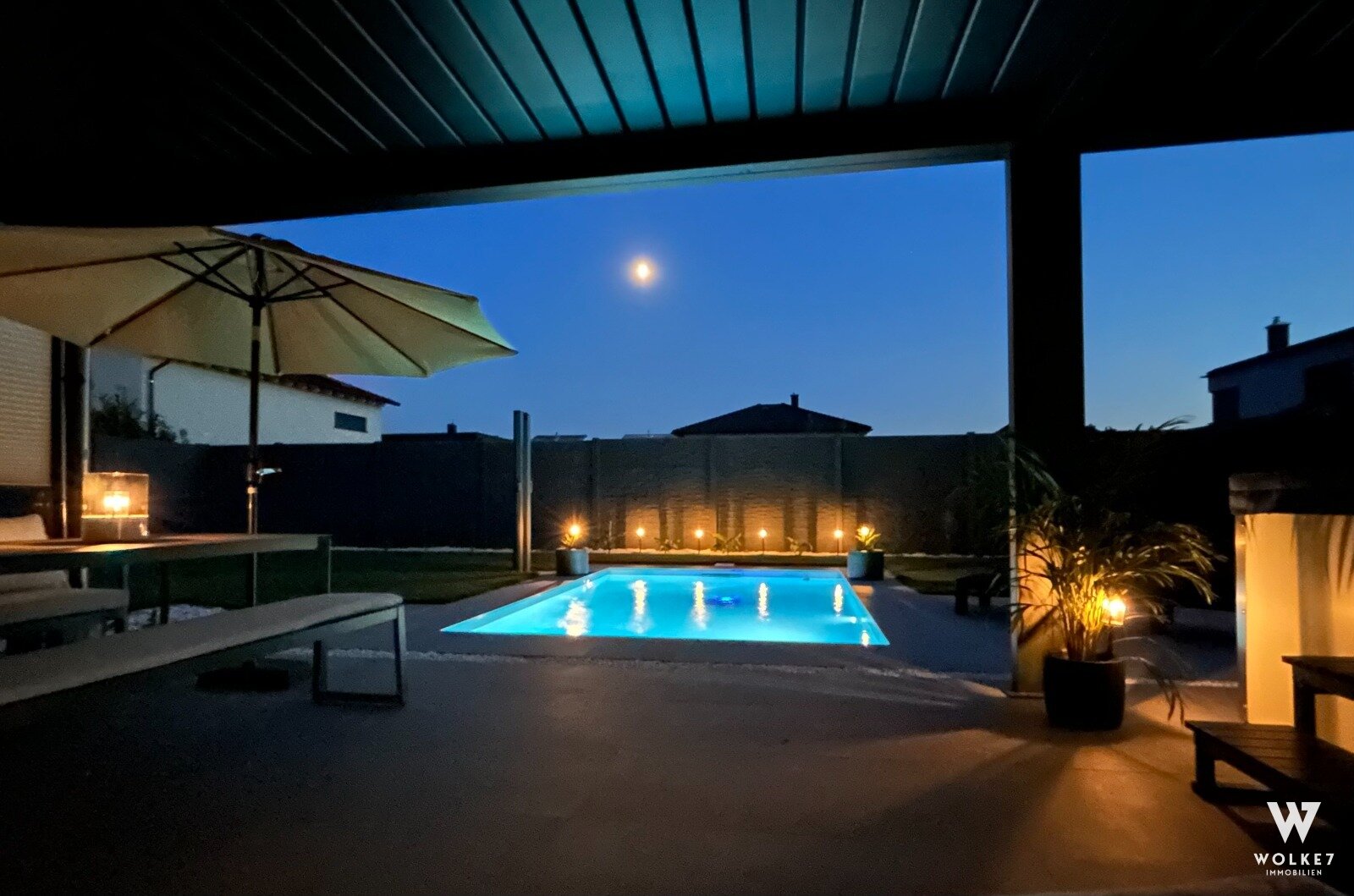 Überdachte, windgeschützte Terrasse mit automatischer Lamellenpergola – perfekt für Sommerabende