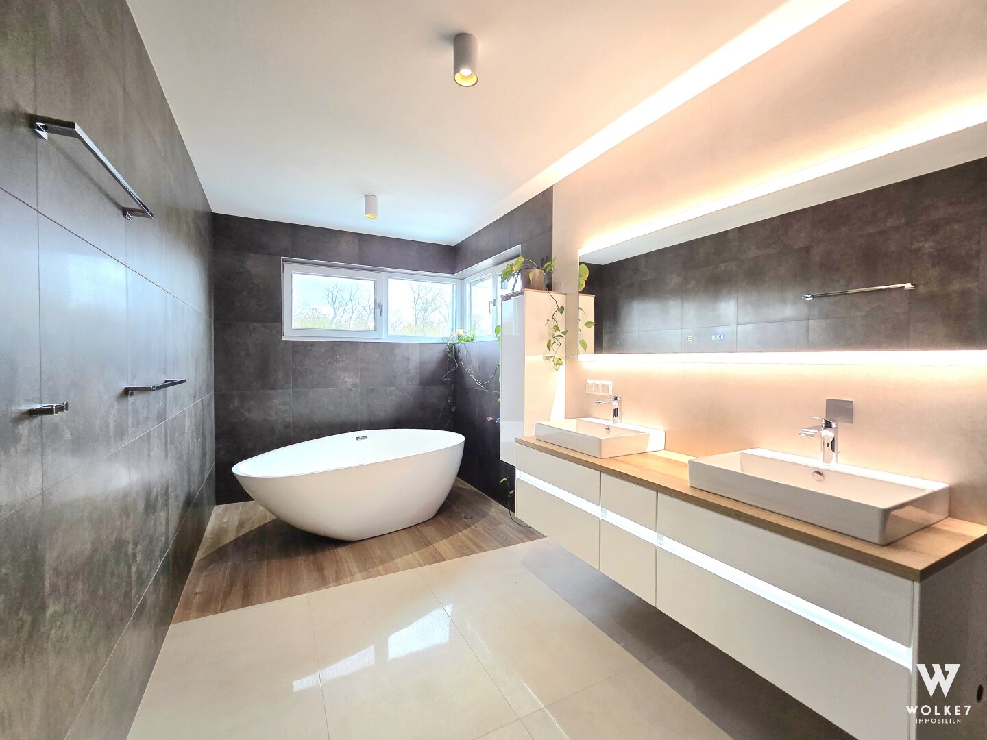 Hochwertiges Badezimmer im Obergeschoss mit freistehender Badewanne, Dusche und Fenster