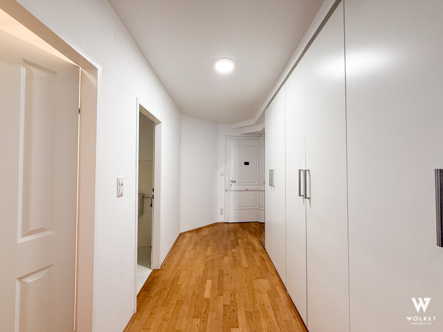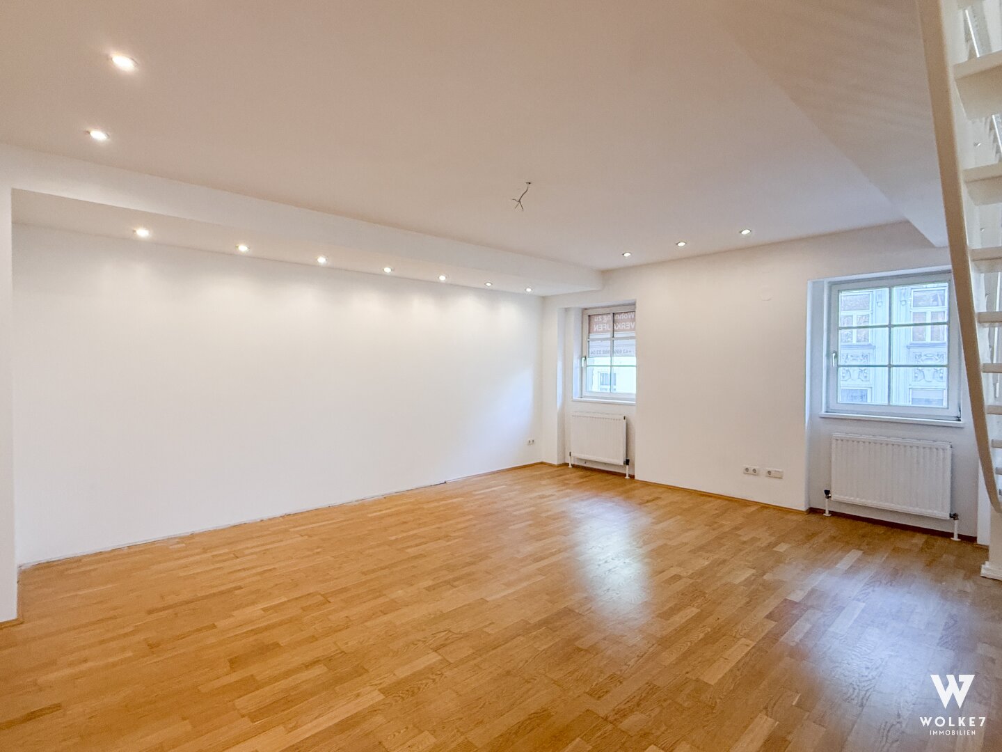 Die Wohnung befindet sich im letzten Liftstock eines gepflegten Mehrparteienhauses und bietet auf zwei Ebenen großzügig geschnittene Räume, durchdachtes Design und ein besonderes Wohngefühl.Bereits beim Betreten überzeugt der einladende Eingangsbereich mit praktischem Abstellraum, Gäste-WC mit Waschbecken und einem eingebauten Garderobenschrank. Der offene Wohn- und Essbereich auf der unteren Ebene beeindruckt durch hohe Fenster, geschliffene Parkettböden und ein lichtdurchflutetes Raumkonzept.