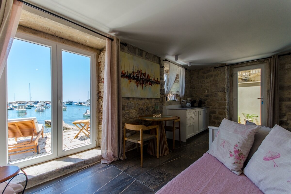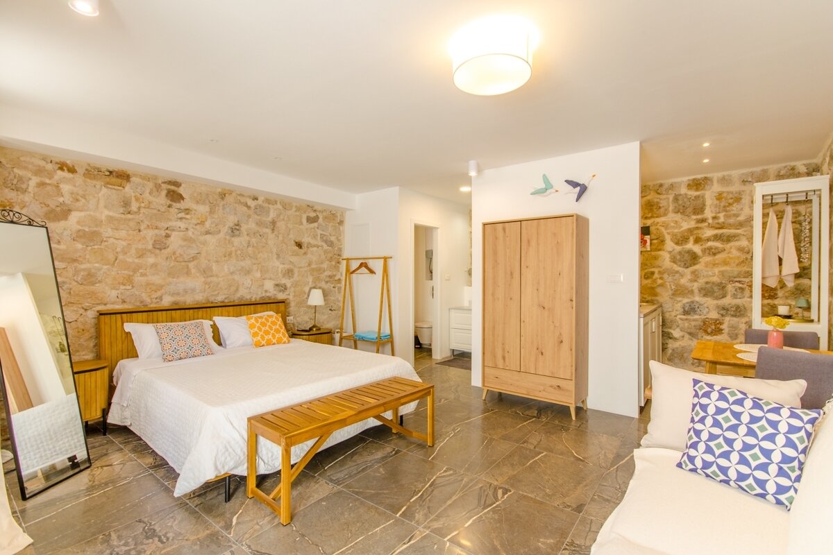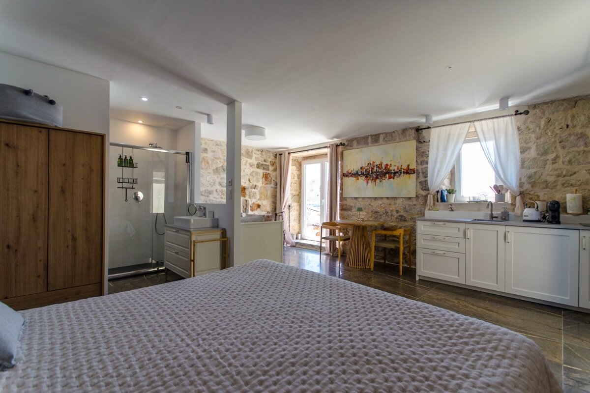 Im Erdgeschoss befinden sich drei separate Studio-Apartments, jedes mit eigenem Bad. Die sorgfältig gestaltete Inneneinrichtung kombiniert Sichtstein und moderne Möbel und verleiht ihnen einen besonderen Charme. Die Apartments eignen sich ideal für Gäste oder die Vermietung, da sie Privatsphäre und separate Eingänge direkt von der Straße oder vom Strand bieten. Ein versteckter Innenhof ermöglicht einen privaten Zugang zu allen drei Apartments. Die Villa befindet sich in unmittelbarer Nähe des Hauptplatzes und der Uferpromenade.