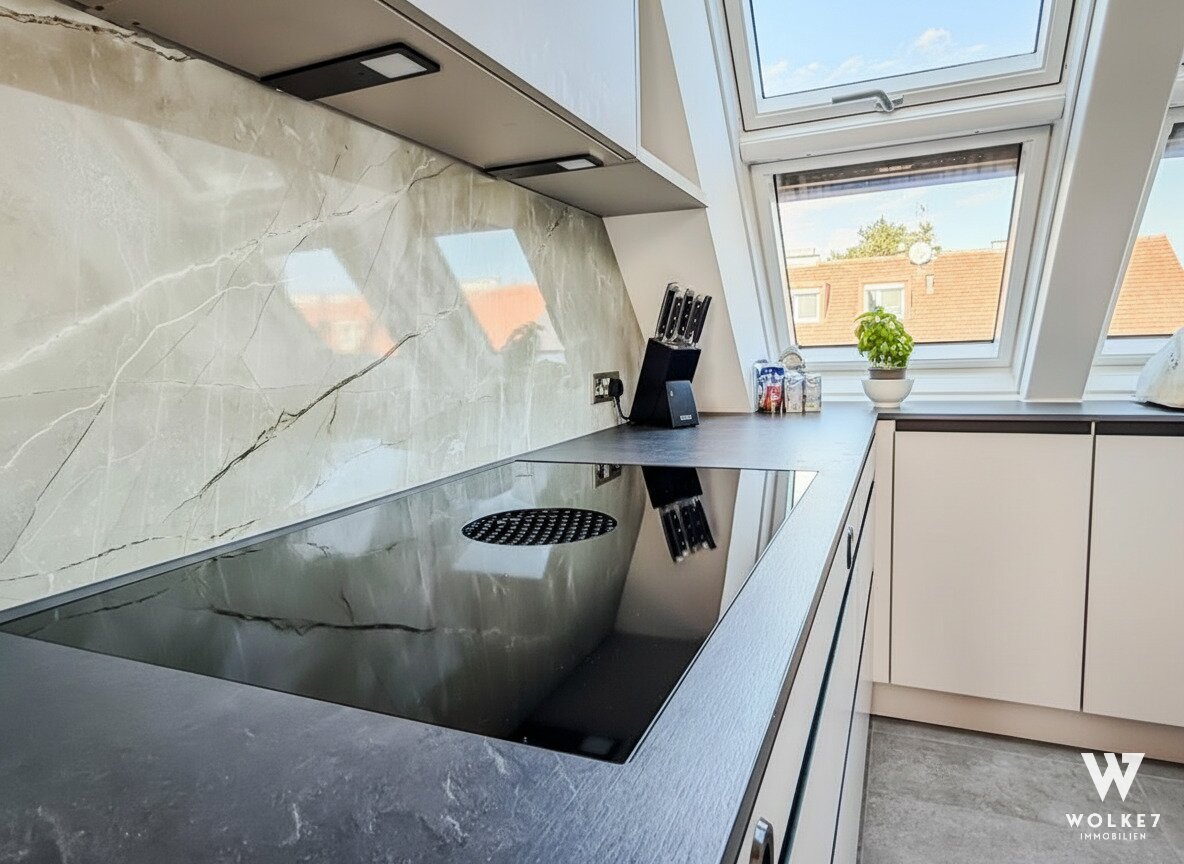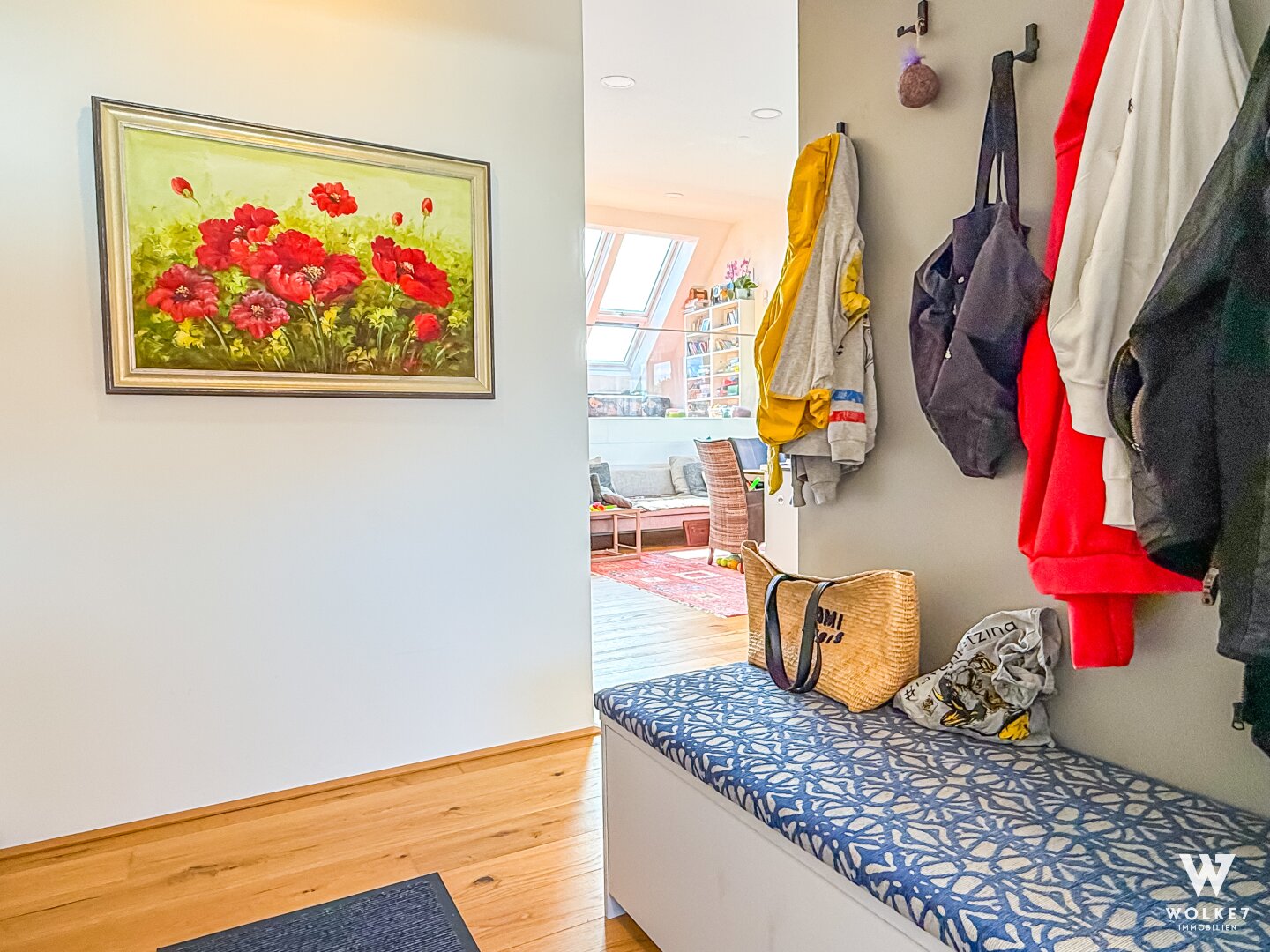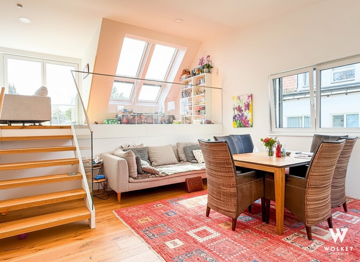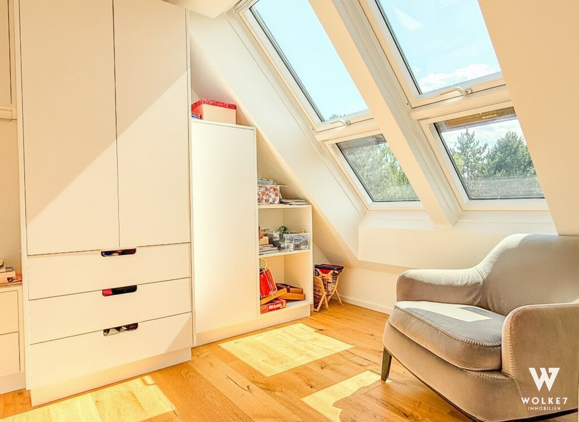 Durch die erhöhte Zwischenebene sind zwei weitere geschmackvolle Zimmer sowie ein hochwertig ausgestattetes Bad mit elektrischem Dachfenster erreichbar. Die durchdachte Architektur mit unterschiedlichen Ebenen schafft eine besondere Wohnatmosphäre: offen, hell und zugleich elegant gegliedert – ideal, um repräsentatives Wohnen und private Rückzugsorte zu vereinen.