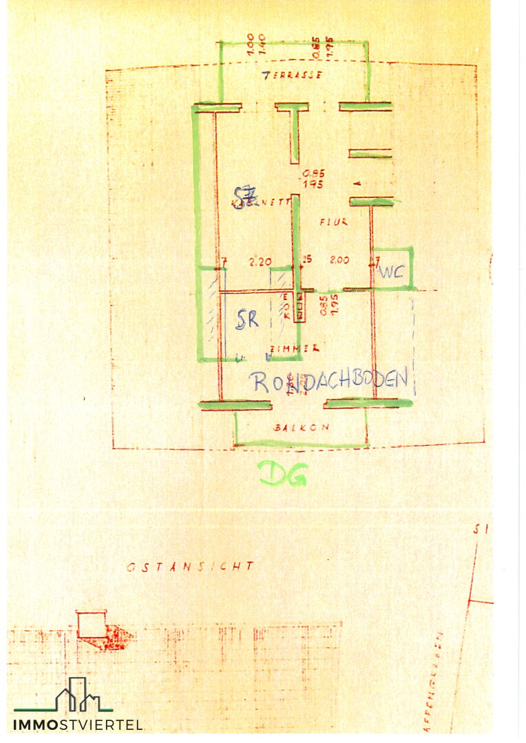 * Dachgeschoss: derzeit ausgebaut ca. 23m² ( Flur, WC, Zimmer mit Schrankbereich, Rohdachboden ) 1 Zimmer mit Balkon wäre noch ausbaubar ( ca. 15 m² Rohdachboden) Terrasse