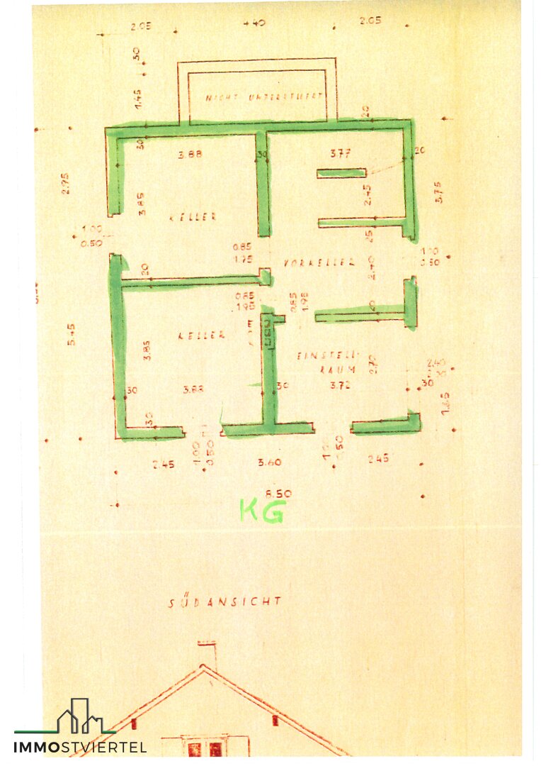 * Vollkeller: ca. 52 m² Nfl. Garage mit el. Torantrieb, Heizraum, Lagerräume