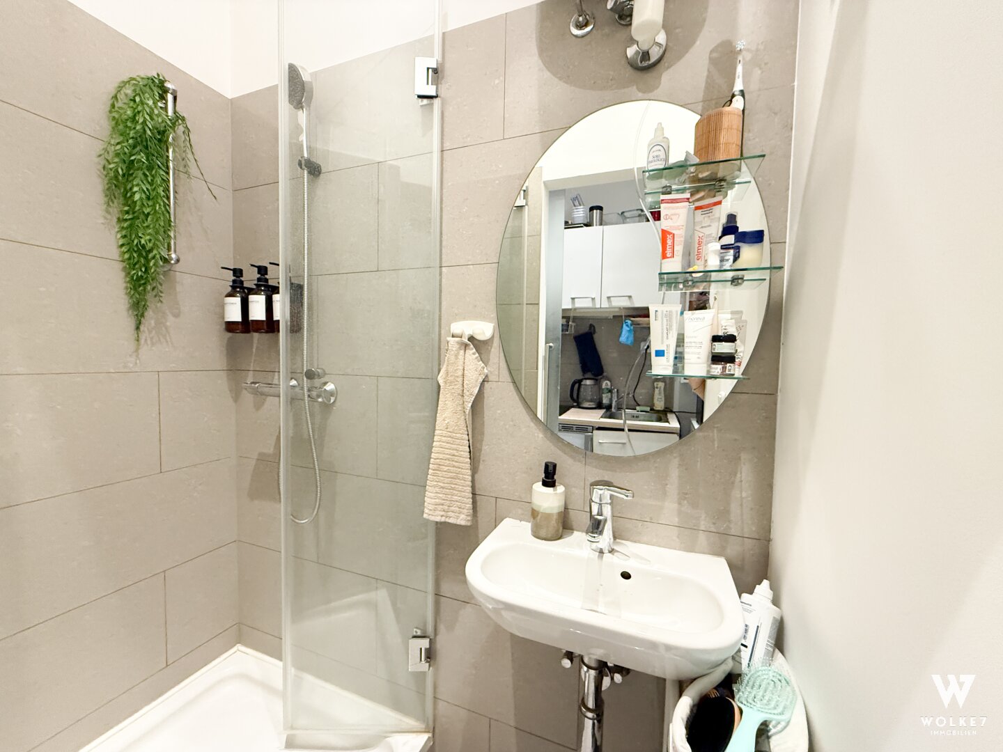 Badezimmer mit Dusche und Waschbecken