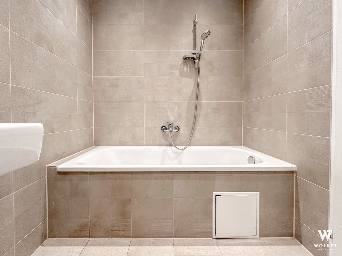 Ein geräumiges Badezimmer mit Badewanne und Markenarmaturen von Grohe, ein separates WC, ein Abstellraum mit Waschmaschinenanschluss sowie zwei weitere Zimmer (ideal als Schlafzimmer, Büro oder Kinderzimmer) bieten viel Platz und Flexibilität. Die Wohnung wird mittels Fernwärme beheizt.