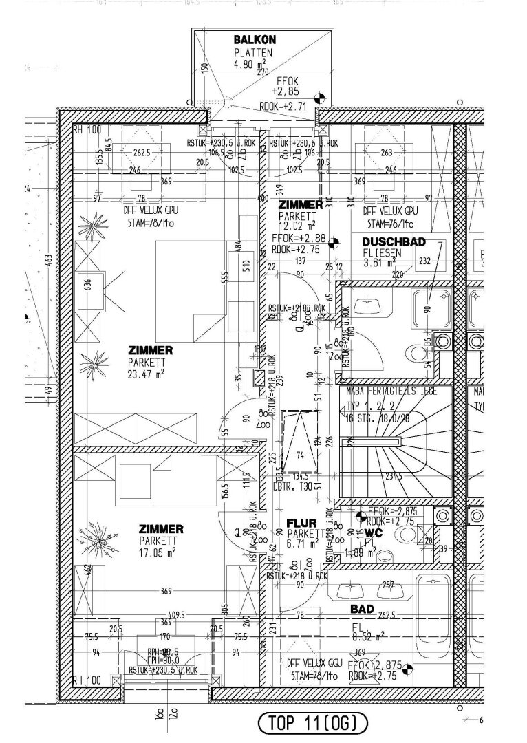 Der Stiegenaufgang führt in das Obergeschoss in dem sich 2 Zimmer, mit Ausgang auf den ca. 5m² großen Balkon befinden sowie ein weiteres Zimmer, ein Duschbad und ein großes Bad mit Wanne, Doppelwaschtisch, Waschmaschinenanschluß und ein separates WC.