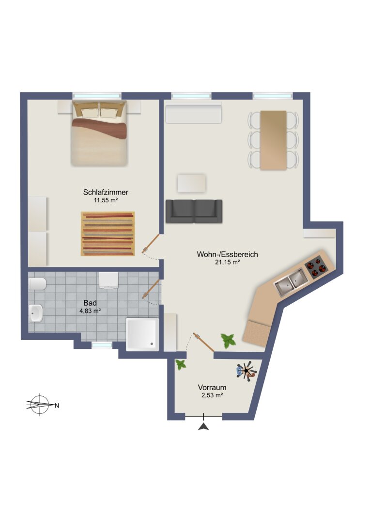 Die ca. 40 m² große Wohnung gliedert sich in:
