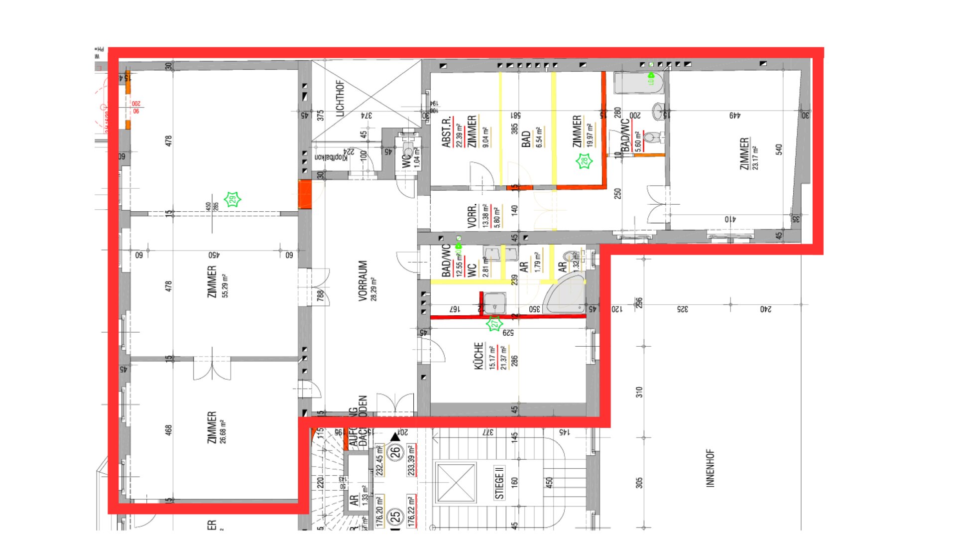 Die Fläche wurde zuvor als Wohnung genutzt und ist in einem sanierungsbedürftigen Zustand, der gleichzeitig eine flexible und individuelle Nutzung ermöglicht. Hochwertiger Parkettboden, doppelflügelige Türen und originale Stuckdecken bilden eine solide Grundlage für die Umgestaltung zu modernen Büroarbeitsbereichen.