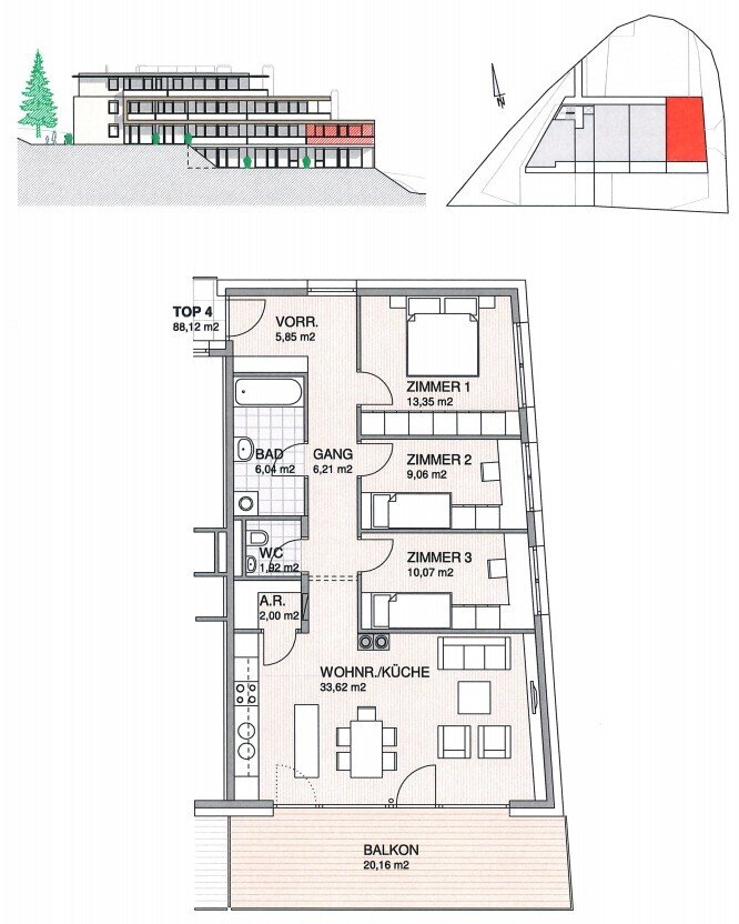um € 35 000.- kann ein Tiefgaragenstellplatz und ein Außenabstellplatz dazu erworben werden