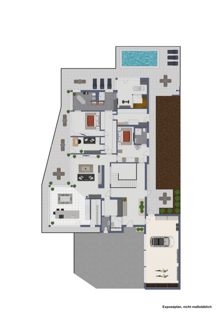 Die ca. 126m² große Terrasse bietet neben dem atemberaubenden Panorama, auch eine Vorbereitung für einen Aussenpool im Aussmass von 7m x 3m, welcher sich direkt vorm Saunabereich befindet.