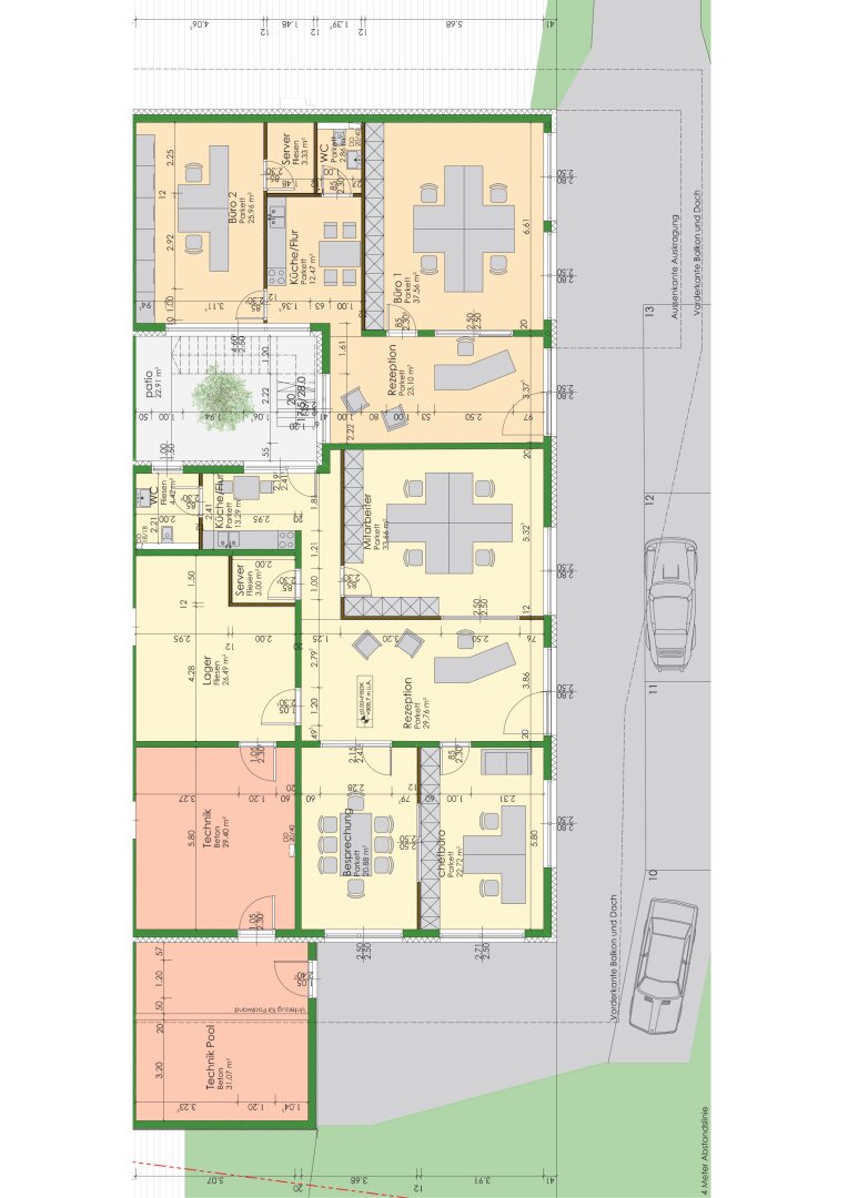 Aussenparkplätze für Mitarbeiter und Gäste sind vor dem Untergeschoss ausreichend vorhanden.