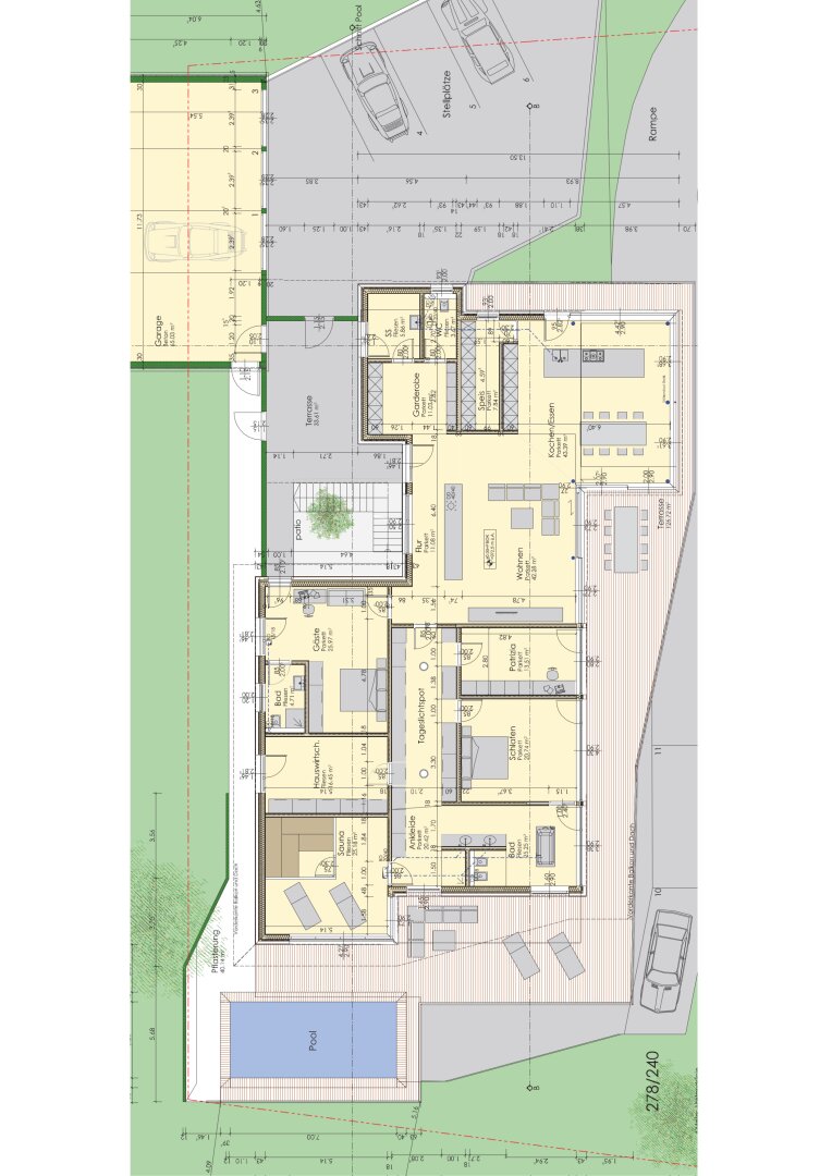 Die bereits in Beton gegossene Wanne, sowie einiges an Pooltechnik im Untergeschoss, ist bereits vorhanden und vorinstalliert, und müsste nur mit einer Beschichtung oder Edelstahlwanne samt ein wenig Technik komplettiert werden.