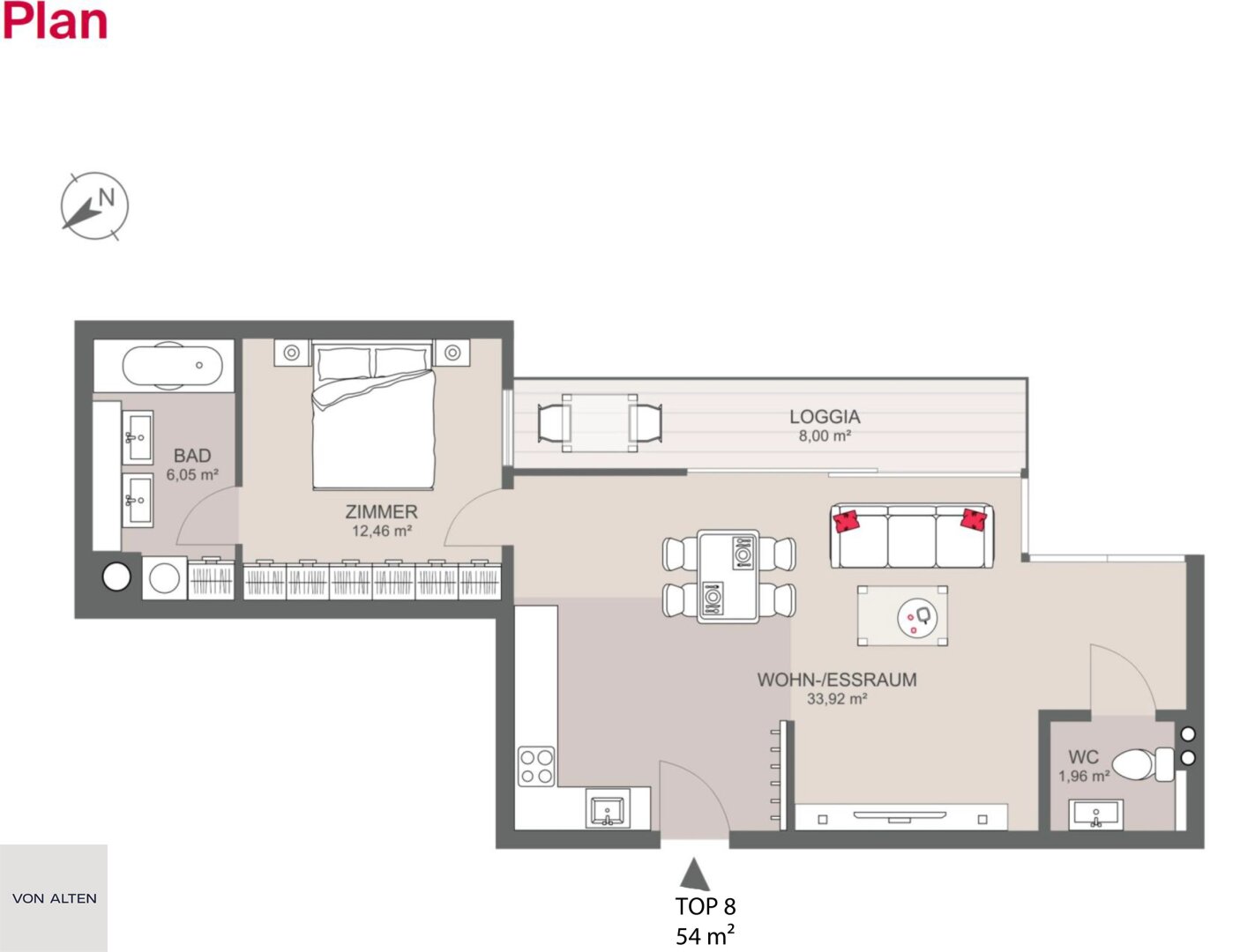 + Wohnfläche ca. 54 m²: 1 Wohnküche & 1 Schlafzimmer