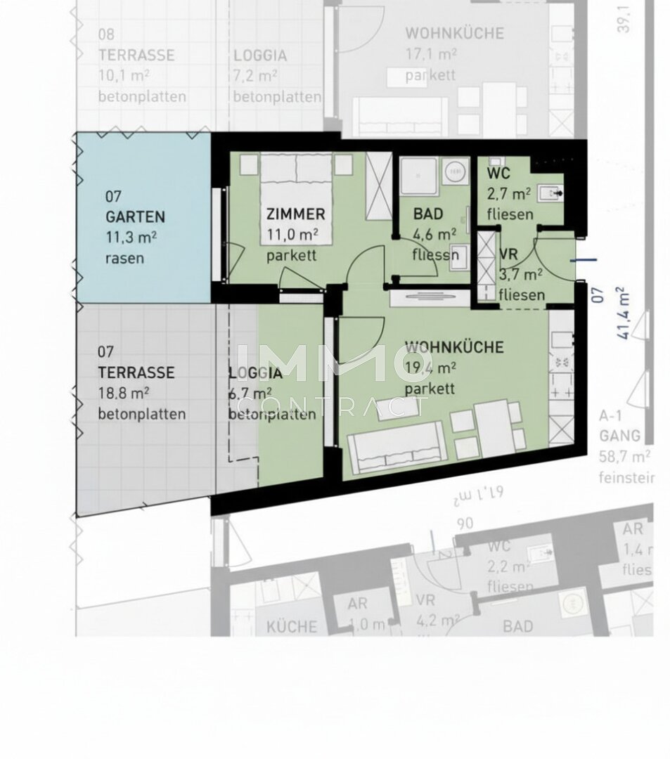 * Jede Wohnung mit privater Freifläche (Loggia, Balkon, Terrasse, Eigengarten)