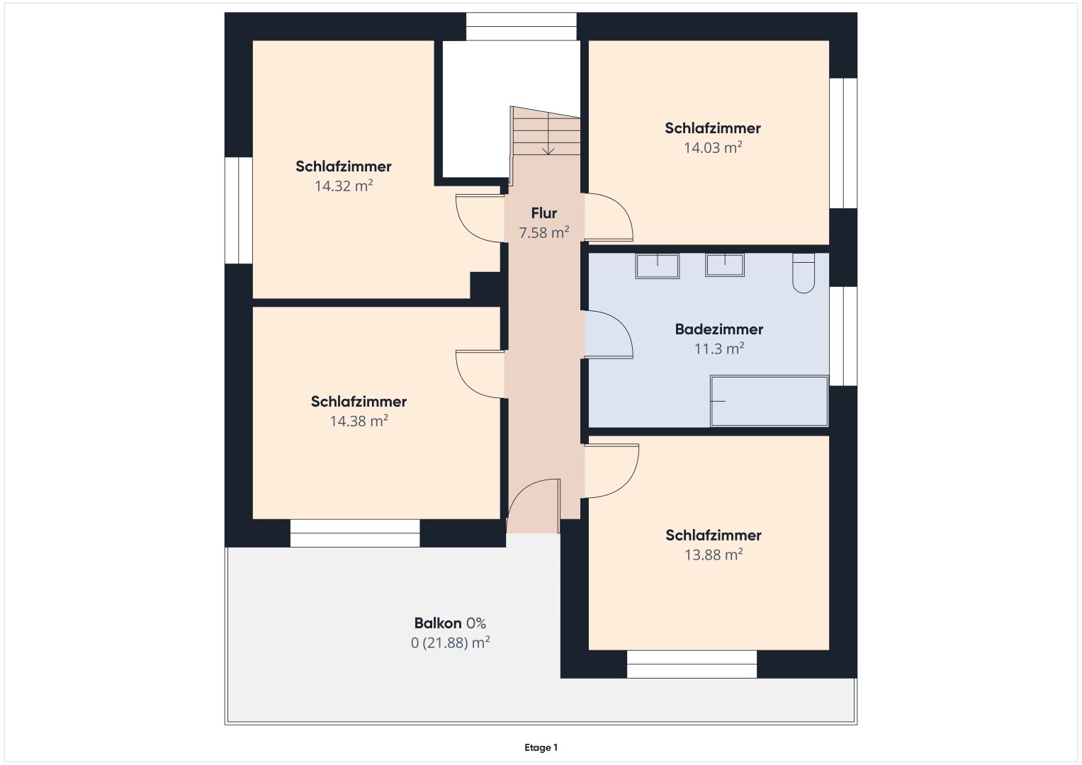 Im Obergeschoss liegen vier Schlafzimmer und ein großes Badezimmer mit Badewanne und Dusche. Der Balkon ist vom Flur im Obergeschoss aus begehbar.