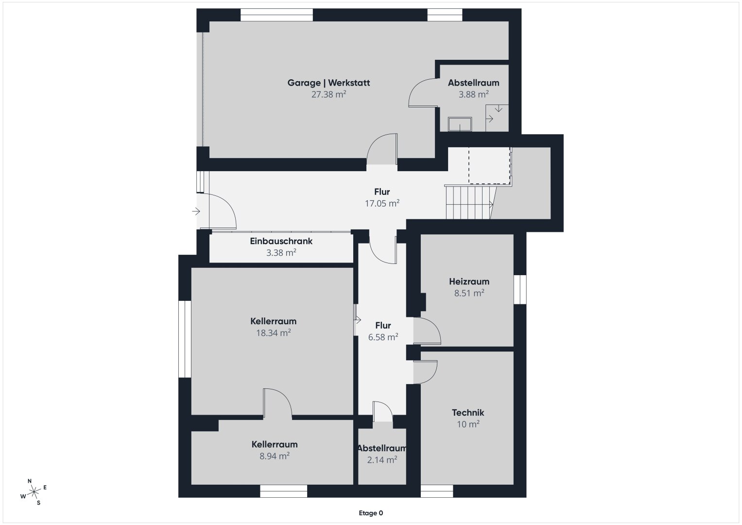 Im Erdgeschoss befinden sich eine Garage mit kleiner Werkstatt sowie der Heiz- und Technikraum. Zusätzlich stehen mehrere Keller- und Abstellräume zur Verfügung, die praktischen Stauraum bieten und vielseitig nutzbar sind.