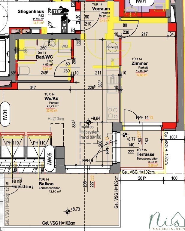 Vorräume, Badezimmer und WC´s werden mit Feinsteinzeug Minimum Größe 60x60 cm ausgestattet.