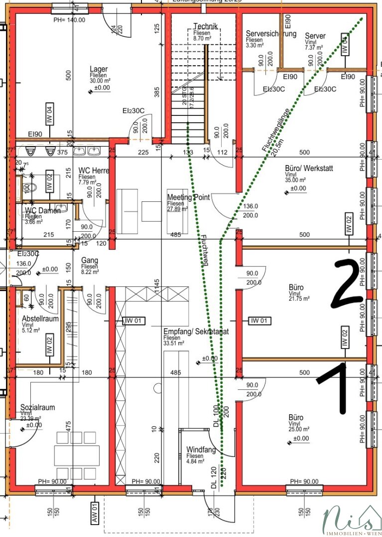 Im Untergeschoß des Gebäudes befinden sich zwei voll ausgestattete Büros, Gemeinschaftsküche, Sanitäranlagen und ein großer Empfangsbereich. Die Büros sind sofort bezieh-/nutzbar.