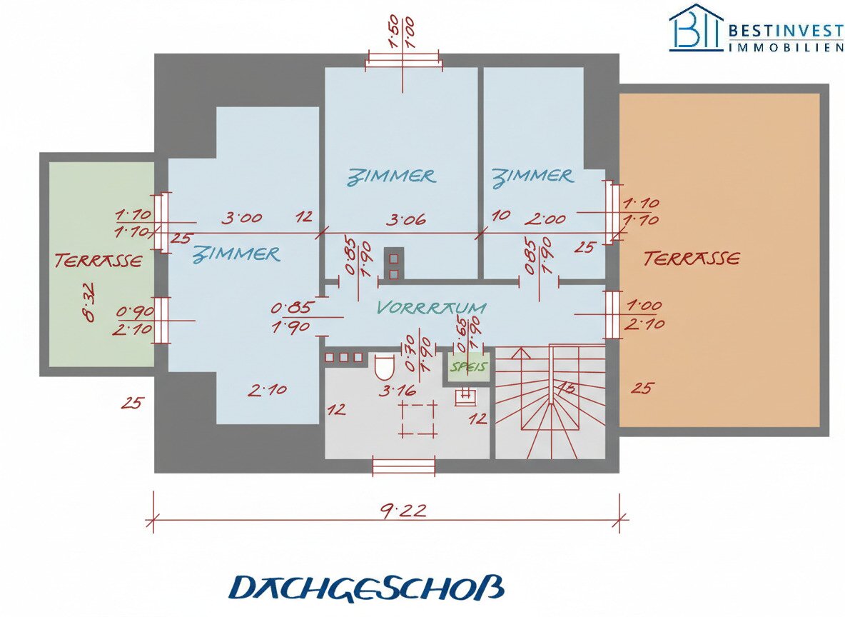 Obergeschoss mit Netto-Fläche von 52m, 2 Zimmer plus Küche, 2 Terrassen:
