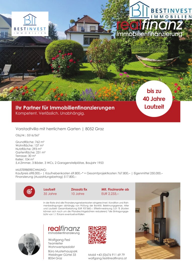 Weitere Angebote sowie Bilder und Videos zur Liegenschaft finden Sie auf unserer Homepage. Gerne unter- stützen wir sie auch bei der Suche nach der passenden Finanzierung und erstellen Ihnen ein kostenloses Finanzierungskonzept.