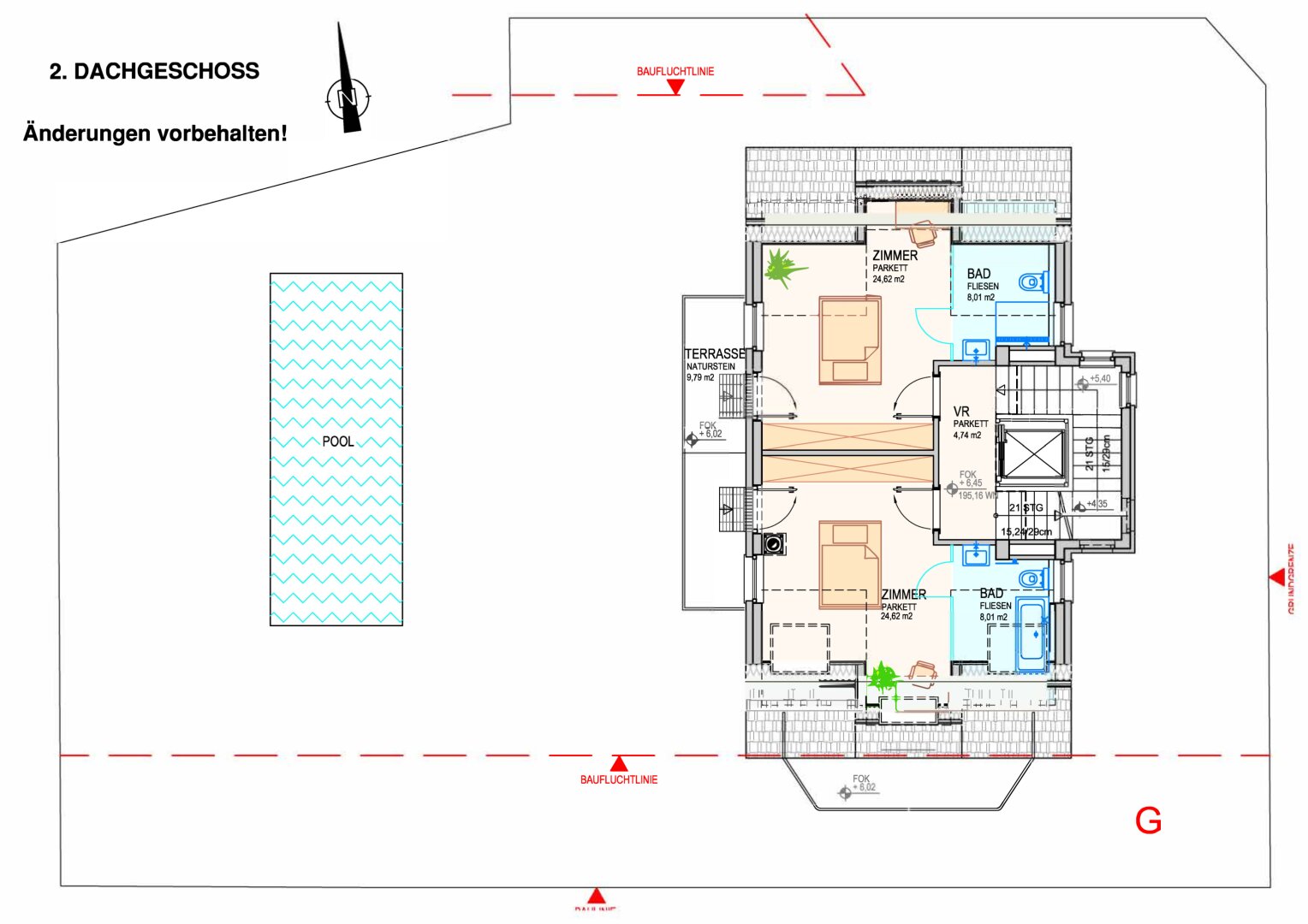 2. Dachgeschoss: Schlafzimmer mit en-suite Bad (Dusche/ WC), Terrasse (9,79 m²) und Schlafzimmer mit en-suite Bad (Wanne/ WC)