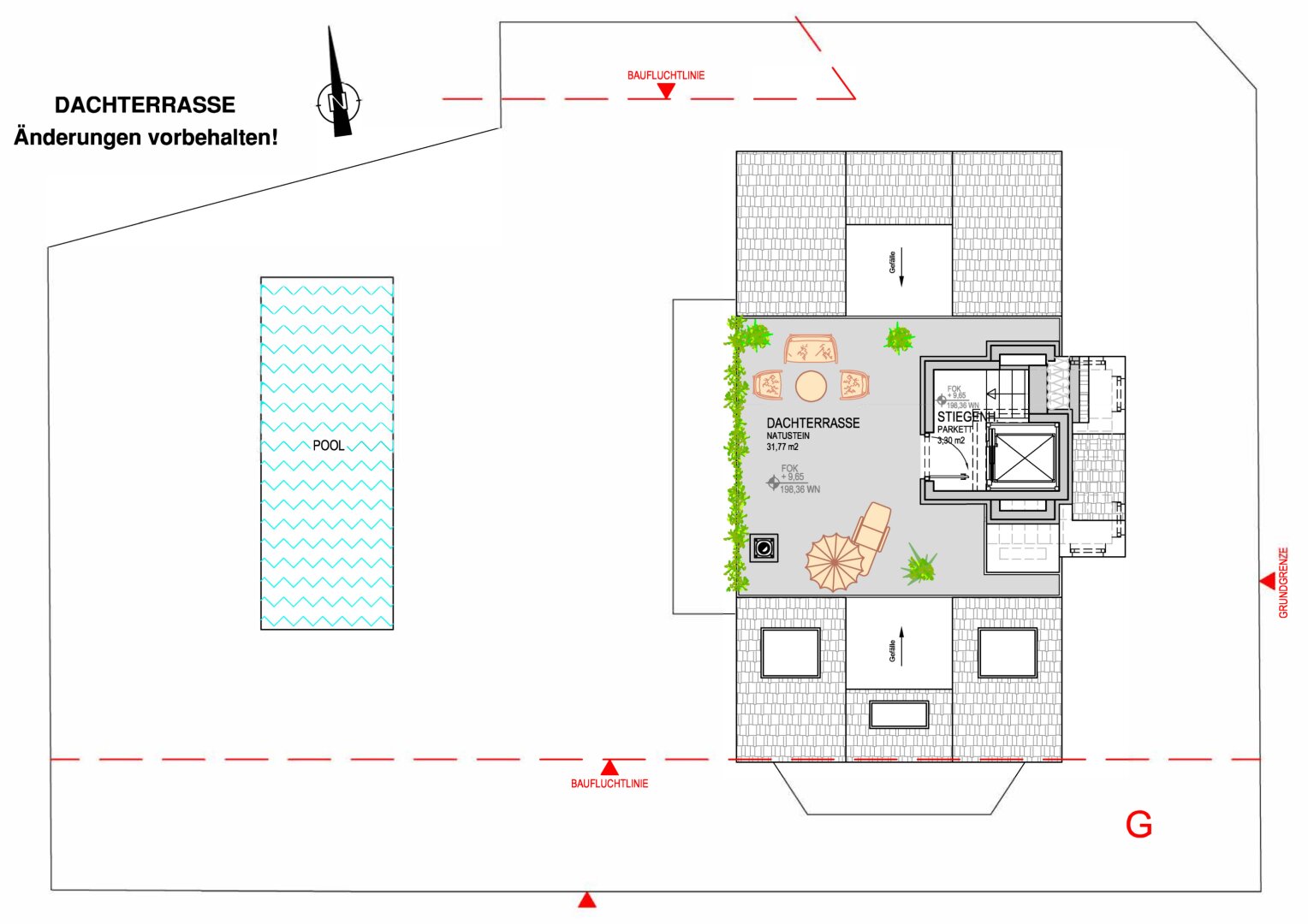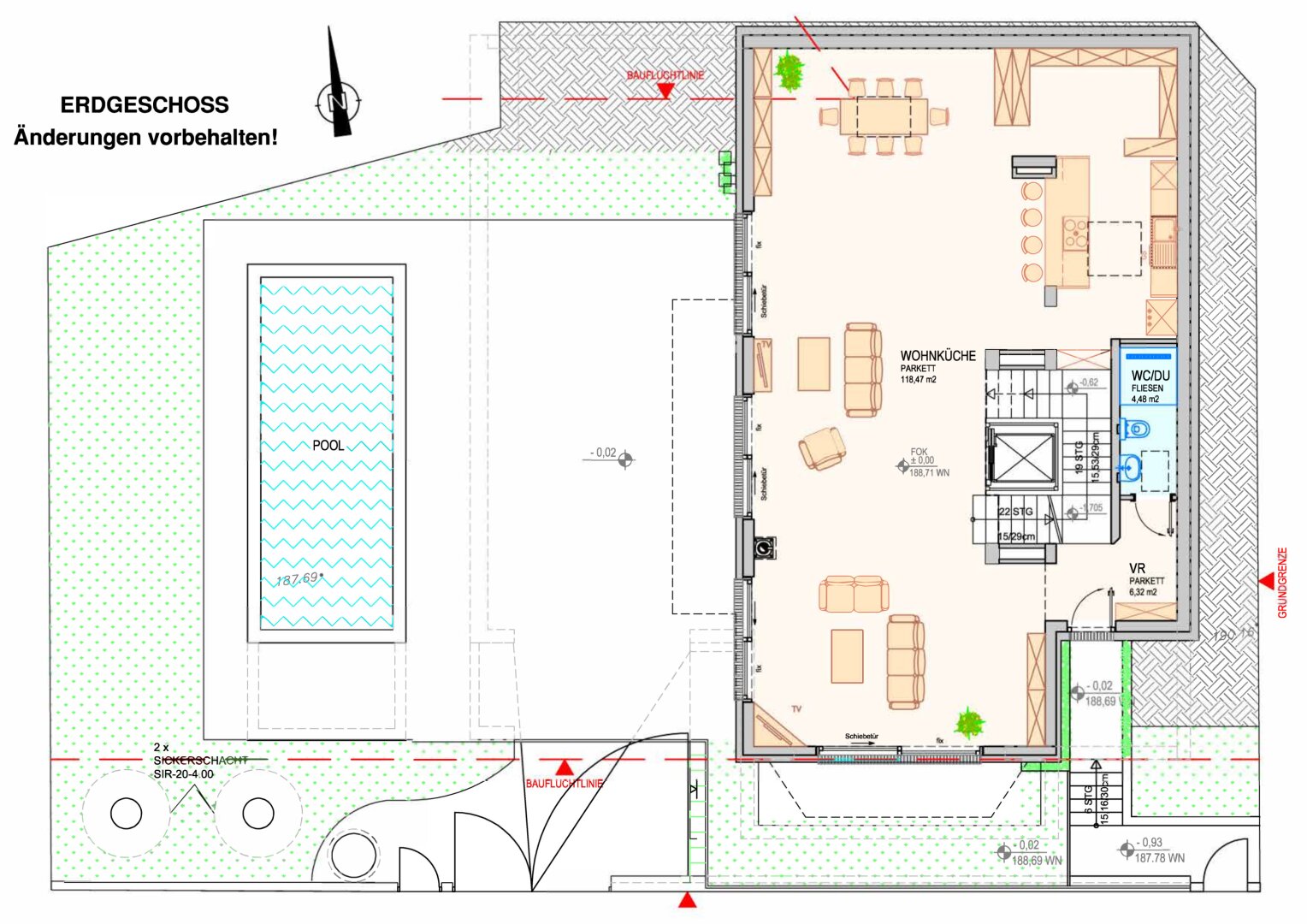 Erdgeschoss: Vorraum, Wohnküche mit Zugang zum Garten (375,25 m²) und Pool