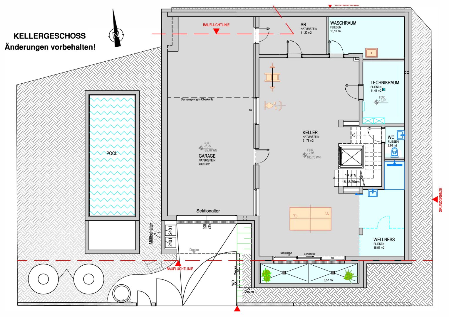 Kellergeschoss: Garage, Keller (Fitness/ Aufenthaltsraum), Wellnessraum, WC, Technikraum, Waschraum und Lichtschacht (Aussenbereich 8,57 m²)