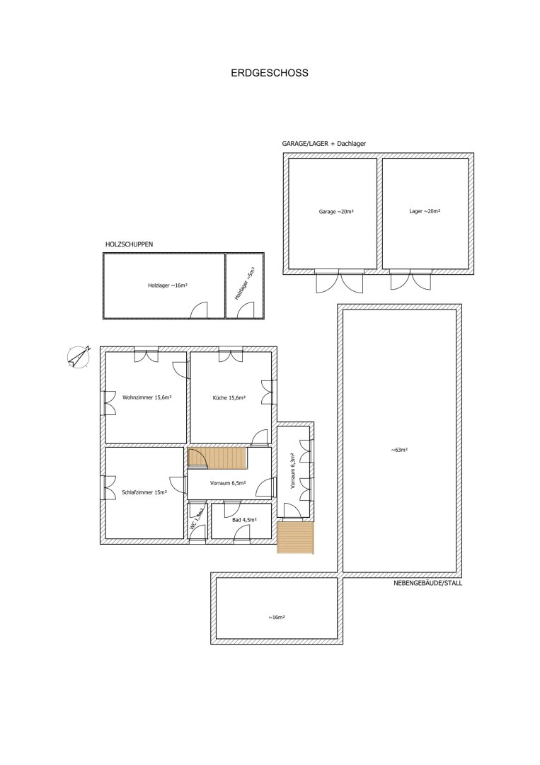 Ergänzt wird das Ensemble durch drei weitere Gebäude, die das Nutzungsspektrum deutlich erweitern. Besonders hervorzuheben ist das ehemalige, sanierte Stall-/Wirtschaftsgebäude mit Waschküche, Brunnenraum, Werkstätte, Stall, Laube, Zimmer und WC. Dazu kommen ein weiteres Gebäude mit Garage, Abstell- und Lagerflächen sowie ein Holzlagerschuppen. Damit eignet sich die Liegenschaft nicht nur als idyllischer Rückzugsort, sondern auch für Menschen mit Platzbedarf, Hobbys, handwerklichen Projekten oder dem Wunsch nach Lager- und Nutzflächen in außergewöhnlichem Ausmaß.
