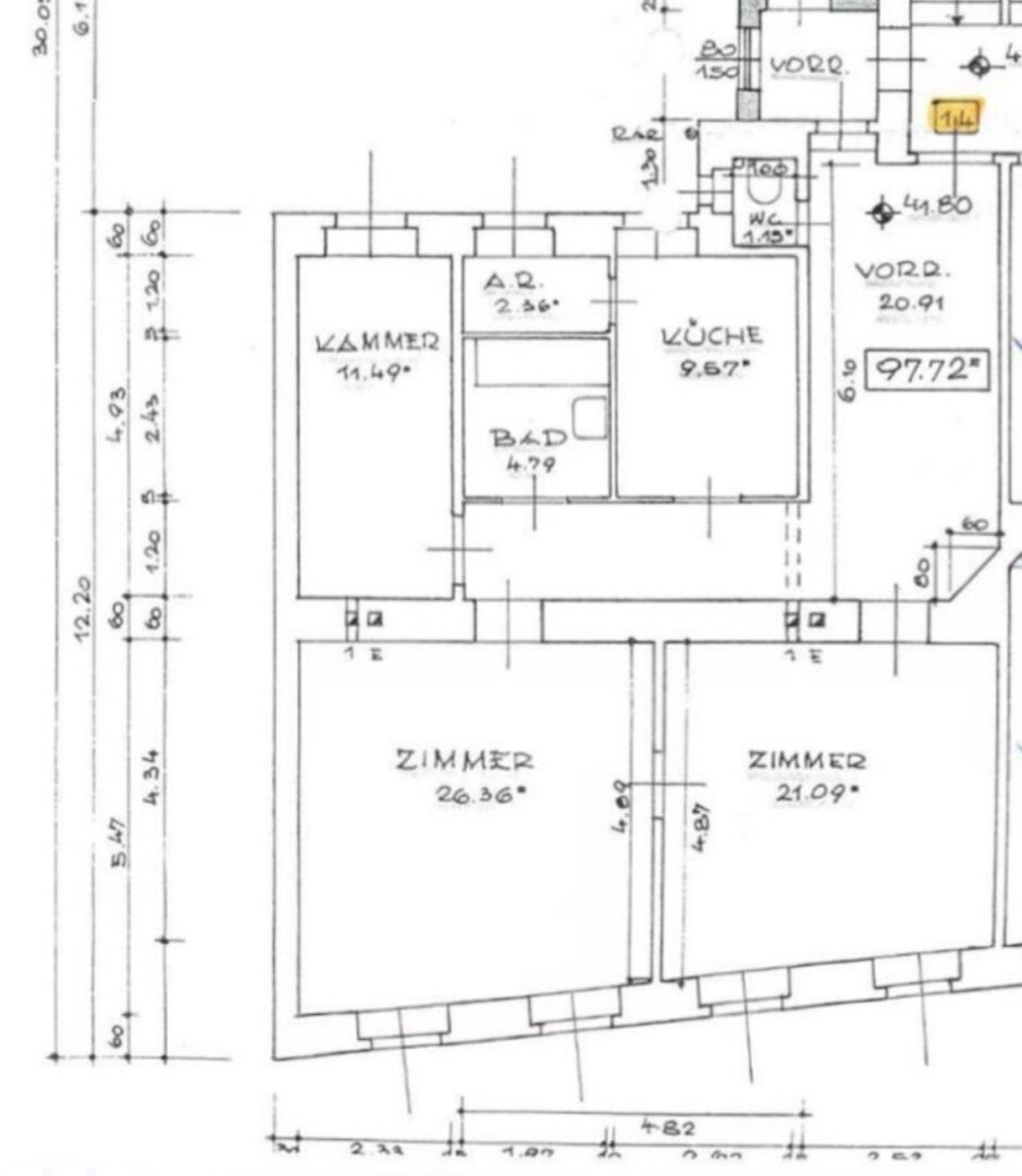 An der Wohnung besteht Sanierungsbedarf. Alle Zimmer sind separat begehbar. Altbauelemente wie Holzkastenfenster, Parkettböden und hohe Räume sind gegeben. Beheizt wird die Wohnung mittels Gasetagenheizung der Marke Junkers, die vor 3 Jahren neu installiert wurde. Zur Wohnung gehört ein Kellerabteil.