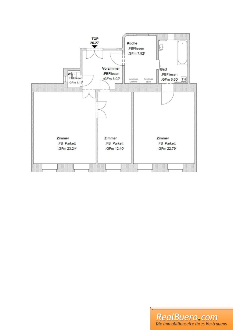 * Küche leer bis auf die Anschlüsse (der Mieter bekommt als Ersatz für Spüle und Herd € 350.-)