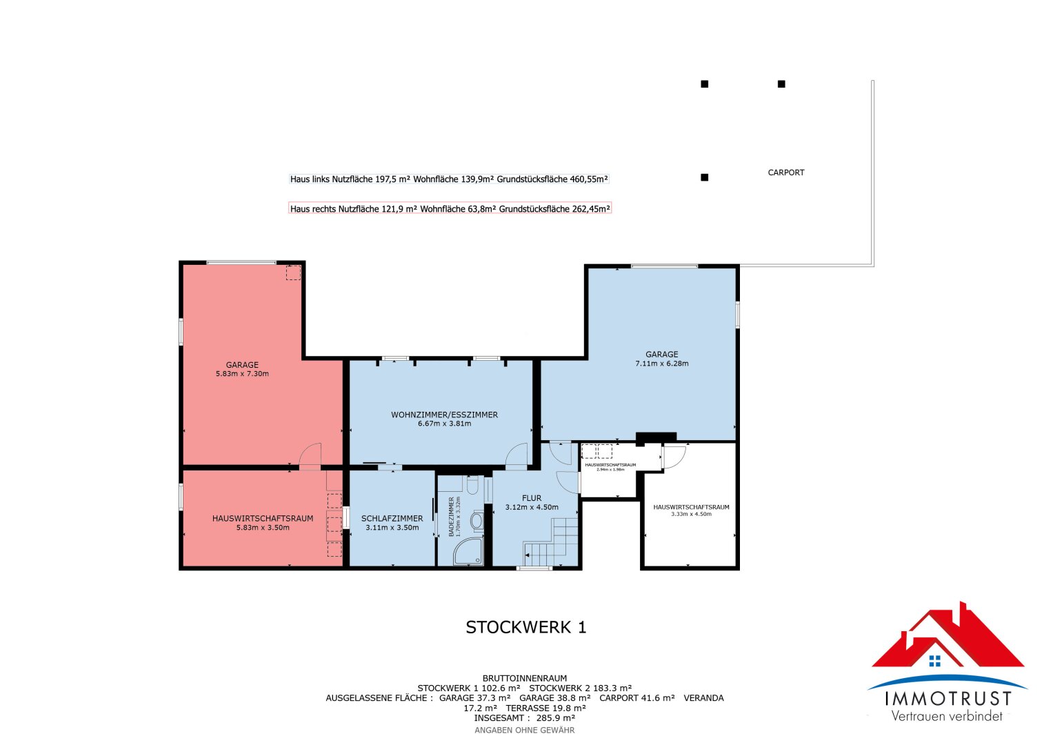 Zur Immobilie gehören zudem großzügige Neben- und Außenflächen, die den Wohnwert erheblich steigern. Neben der bereits erwähnten überdachten Terrasse stehen Ihnen eine Garage mit ca. 37,8 m², ein Abstellraum mit ca. 13,9 m², ein Treppenhaus mit ca. 12,5 m² sowie ein Doppelcarport mit ca. 41,6 m² zur Verfügung. Damit ist reichlich Platz für Fahrzeuge, Hobbys, Lagerflächen und praktische Alltagslösungen vorhanden.