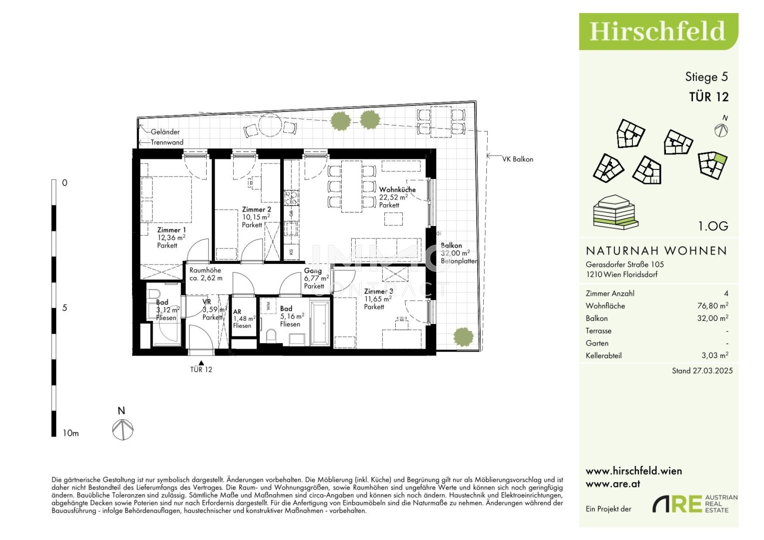 Am Rande eines weitläufigen Grünzugs, der sich bis zum Bisamberg erstreckt, entstand im naturnahen Hirschfeld ein einzigartiges Wohnquartier: Auf drei Bauplätzen entwickelt sich ein modernes Architektur-Ensemble mit elf Gebäuden und rund 440 Wohnungen – ideal für alle, die Ruhe im Grünen mit urbaner Lebensqualität verbinden möchten. Besonders punktet die Wohnanlage beim Thema Nachhaltigkeit: Hirschfeld erfüllt den klimaaktiv Silber Standard und überzeugt als Niedrigenergiehaus mit innovativem Energiekonzept.