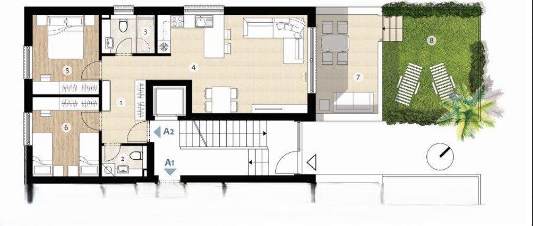 3-Zimmer-Apartments A2 / Erdgeschoss, gut aufgeteilt bietet:
